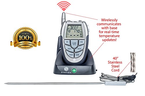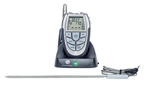 ZVATION WIRELESS LONG RANGE MEAT THERMOMETER - For cooking to perfection, no guessing required with our pre programmed for Beef, Veal, Lamb, Pork, Chicken and Turkey. Plus you can set how you want it: Well Done, Medium, Medium Rare or Rare. If you want to set a different food or temperature you can set it to alarm you when getting to your temperature set for all Solid or Liquid Foods.