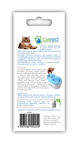 -. Feature : How many of us brush the teeth of our cat or other pets? How great would it be if cats could help clean their teeth by simply drinking water? Our solution: Cat H2O with Dental Care / Cat H2O water fountains will encourage your cat to drink more water and together with Dental Care by Cat H2O, will provide improved daily oral hygiene while simply drinking water / EFFECTIVELY protects against plaque & tartar build up, for healthier gums & fights bad breath. BONUS Calcium supplement for stronger teeth / Dental Care by Cat H2O is designed, formulated & made in Australia. 99% ODOR, TASTE & COLOR FREE, even the pickiest cat will enjoy their water / Contains Glucose Oxidase, an enzyme that is scientifically proven to react with glucose, forming a powerful cleaning and anti-bacterial agent. It simply helps keep your pet's teeth clean / This is a CatH2O replacement part / Part Number CH08DC / This is an aftermarket of generic part