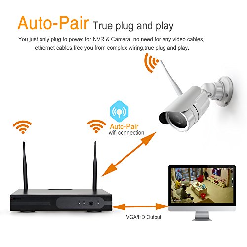 Easy and Quick Setup: AUTO-PAIR technology, making sure you only need to plug them in power to start working. Plug and Play for real.;Do not require a separate wireless router,automatic connection with IP, no need ethernet cable,no exposed lines anymore,more beautiful,more hidden,more safely and save installation cost.NOTED:THE WIRELESS SYSTEM DO NOT MEAN YOU CAN USE THE SYSTEM WITHOUT ANY CABLES. YOU HAVE TO CONNECT THEM TO THE POWER ADAPTERS FOR SUPPLYING POWER TO CAMERAS AND NVR.