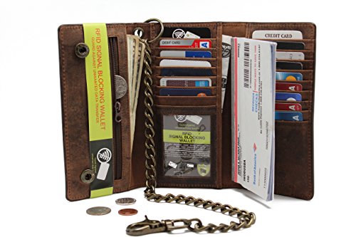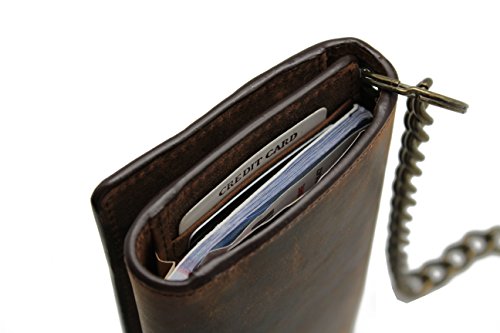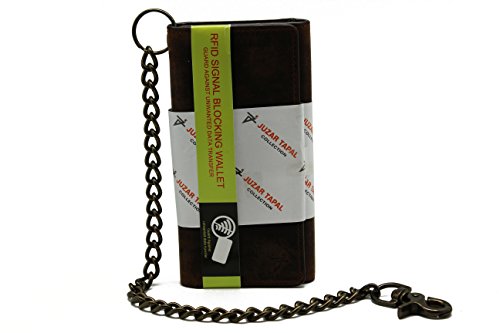 -. Binding : Apparel -. Brand : Juzar Tapal Collection -. Color : Rusty Brown -. Department : mens -. EAN : 0754242368953 -. Feature : Genuine Cow Leather RFID Radio Frequency Identification Signal Blocking / Size 7.25 x 0.5 x 4.0 with 17 Card Slots Including Thum Pull Window ID / 3 Large Side Slips for Cash,Checkbook & Receipts / 1 Large Zipper Pocket for Coin & Other / 18'.0 Long Stainless Bronzel Chain including Key Ring & Claw Hook Heavy Thread with Quality Stitching -. IsAdultProduct : 0 -. Model : JTC-21253-RF LCW -. PackageQuantity : 1 -. ProductGroup : Apparel -. ProductTypeName : ACCESSORY -. Size : Large -. Title : Men's Cow Leather Crazy Horse Brown Long Checkbook Trifold Stainless Bronze Chain Wallet R.F.I.D Signal Blocking Bikers Trucker's -. UPC : 754242368953