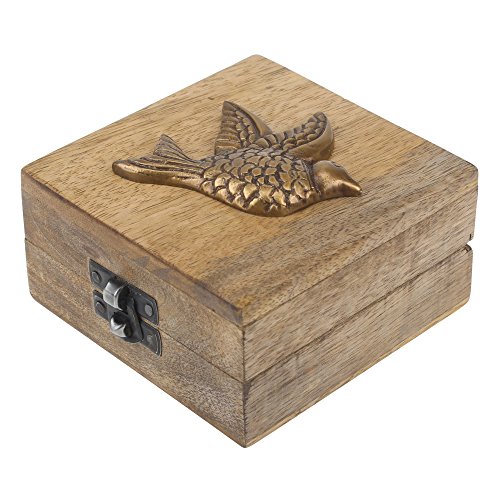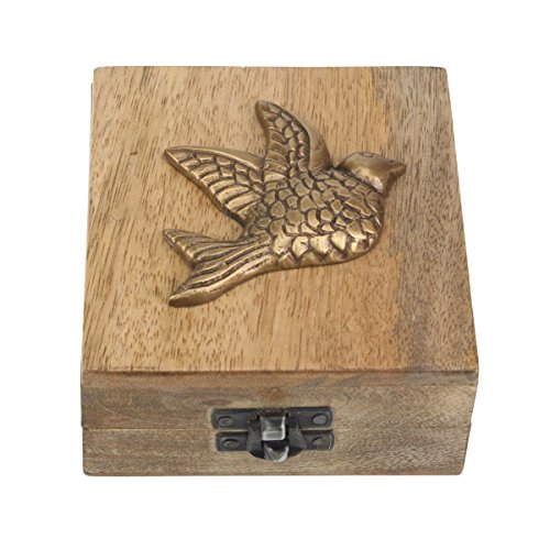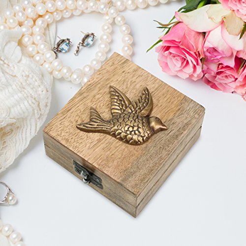 - This decorative wooden storage container features a natural wood finish and a bronze dove detail on the hinged lid