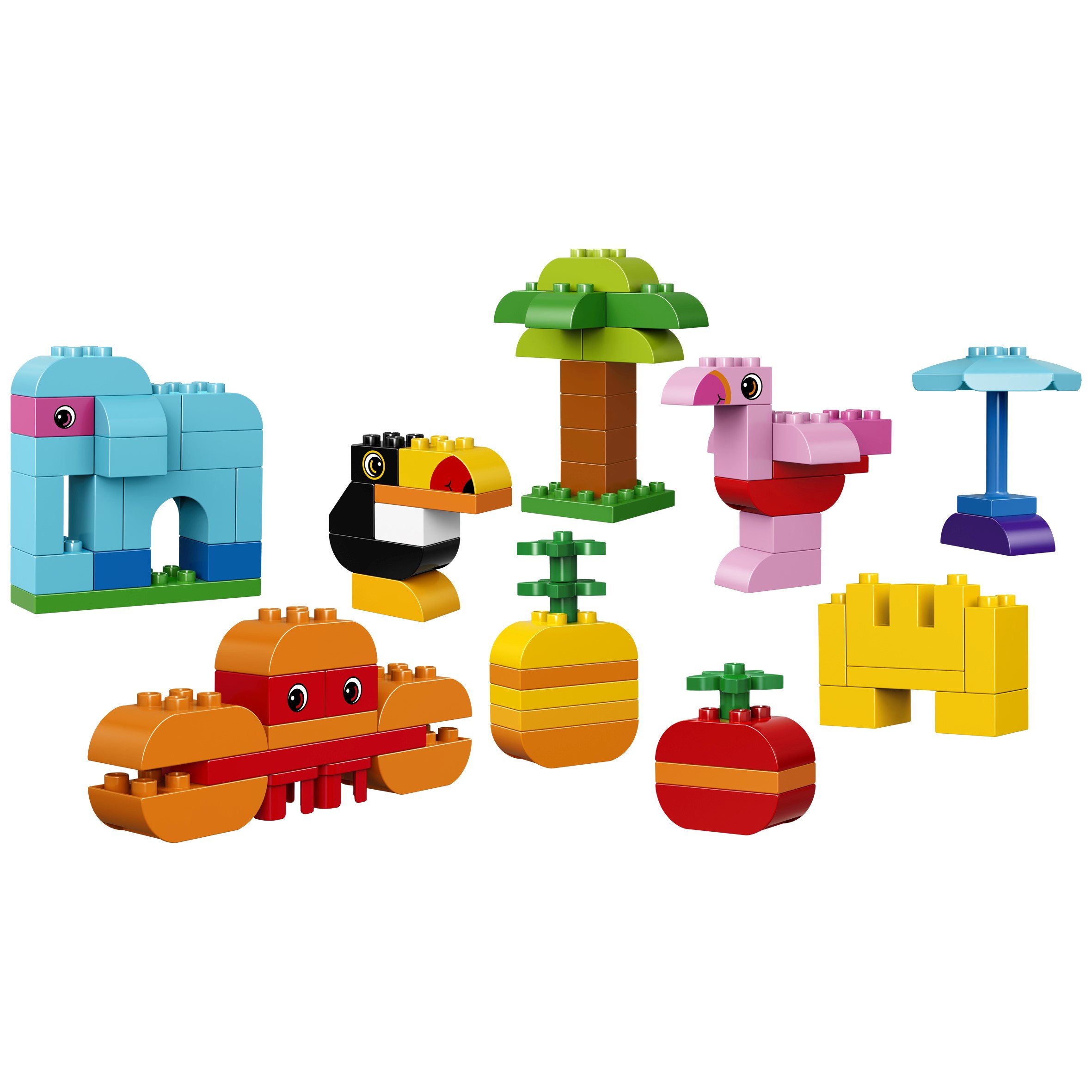 Let's assemble tropical things, such as elephants, pineapple, sunshine and crabs, using Lego® Duplo's bright colored blocks.