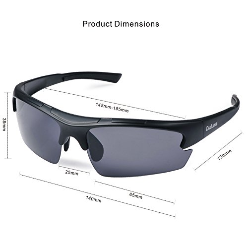 - Feature : TAC POLARIZED LENS- 100% UV400 protection coating, blocks 100% harmful UVA & UVB Rays. Restore true color, eliminate reflected light and scattered light and protect eyes perfectly. TAC lens includes 7 layers. The 1st layer is polarization layer. The 2nd and 3rd layers are bonding layers to enable durability. The 4th and 5th layers are UV protection layers to absorb UV light. The 6th and 7th layers are shatterproof layers. / PRODUCTS DIMENSION- Lens height:40 mm (1.57 inches); lens width:66mm (2.59 inches); leg length:140mm(5.51 inches); nose bridge:12-30 mm (0.47-1.18 inches); frame length: 140mm (5.51 inches). / GOOD LOOK, SUPERLIGHT, STYLISH, DURABLE AND CLEAR- Flattering lines & design features create aesthetically pleasing appearance. Lightweight design is ideal for motorcycle and cycling bicycle, driving, running, fishing, racing, skiing, climbing, trekking or other outdoor activities. Fashion and stylish design, with rich color combinations of frames and lens. Polycarbonate lens and frames are impact, scratch resistant and durable. Rimless jacket frame design enables clear lower vision field. / LIFETIME BREAKAGE WARRANTY ON FRAME- Frames and lens are unbreakable for no risk purchasing. In case any broken problem happens, contact the seller of Duduma without hesitation to solve the problem until satisfaction. Duduma provides lifetime after sale service for all Duduma products. / 30 DAY MONEY BACK GUARANTEE- All Duduma customers enjoy 30 Day Money Back Guarantee. Customers can return and get refunded in case the purchasing is not satisfactory for any reason. You have no risk to try.