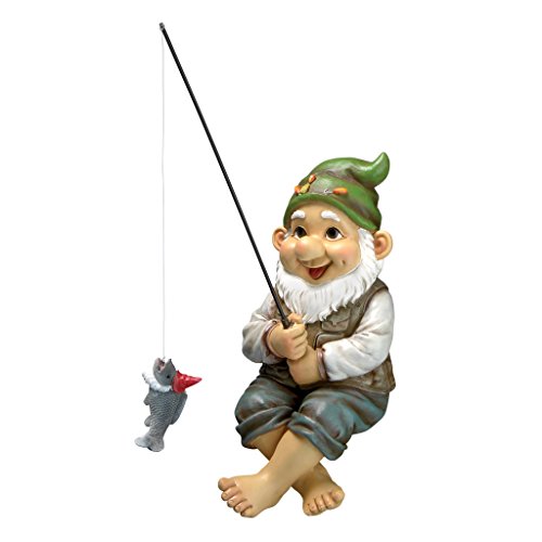 FISHING GNOME - Don't let the "big one" get away! Our garden gnome, ready to sit on your garden wall or pond edge, has caught a wee little fish complete with red hat and gnome beard.