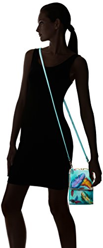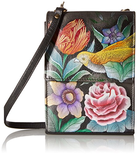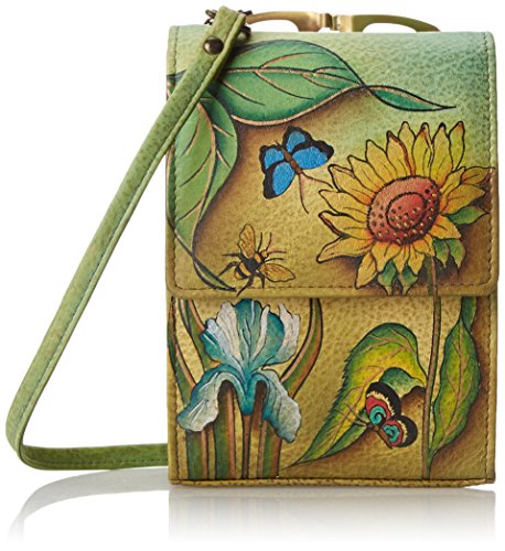 Mini sling organizer-flap over entry with magnetic closure. Expandable gusset opens wide to two compartments and a zippered partition pocket. Inside 8cc pockets. Detachable key fob. Mirror under rear framed coin pocket. Detachable cross body shoulder strap. 5 inch x 6 inch x 2.5 inch