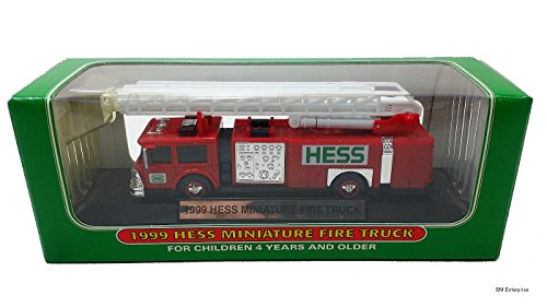 -. Binding : Toy -. Brand : Hess -. EAN : 0071896465587 -. Feature : BRAND NEW NEVER HAVING BEEN DISPLAYED OR PLAYED WITH,OR ANYTHING ELSE! -. IsAdultProduct : 0 -. Label : Hess -. LegalDisclaimer : Terms & Conditions: If there is any problem with your order please contact us via the Amazon message center within 48 hours of receiving your order so we can assist you. If you would like to return an item purchased from Hess Toy Trucks please note our return policy. If we have sent you the wrong item we will issue you an RMA (Return Merchandise Authorization) number and we will pay for return shipping. If you received the correct item but have decided to return the item, then you are responsible for paying return shipping and insurance on the item so that it arrives in new condition. Once the item is inspected you will be issued a refund less a 20% restocking fee. -. Manufacturer : Hess -. Model : h-99 -. MPN : h-99 -. PackageQuantity : 1 -. PartNumber : h-99 -. ProductGroup : Toy -. ProductTypeName : TOYS_AND_GAMES -. Publisher : Hess -. Studio : Hess -. Title : 1999 Hess Minature Toy Fire Truck -. UPC : 071896465587