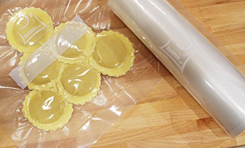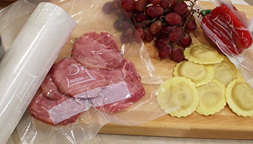 100 FEET OF VACUUM BAGS: Includes 4 rolls. 2 rolls that are 8-inches by 25 feet long and 2 rolls that are 11-inches by 25 feet long. 100 total feet of vacuum sealer bags. Enough to make 50 Quart-size Bags and 38 Gallon Size Bags (but with the option to make larger or smaller bags).