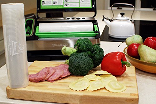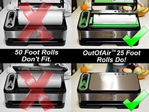 FITS INSIDE MOST MACHINES: Other rolls are too large to fit inside most FoodSaver® vacuum sealers. No more struggling to manage extra-large rolls. Simply place inside your machine and use the machine's built in cutter. OutOfAir™ rolls are the longest available that will still fit.
