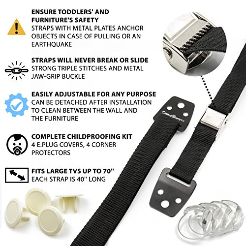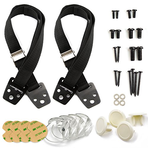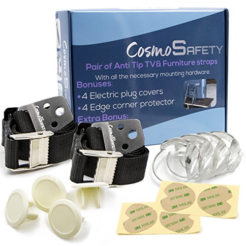 - 100% MONEY BACK GUARANTEE: CosmoSafety uses only the highest quality materials; our products are factory-tested, so we are confident you will love them; you are backed by our no questions asked, 90-day money back warranty; the COSMOSAFETY ANTI-TIP SAFETY STRAP SET comes with 2 straps with plates, buckles, and hardware, 4 corner protectors, 4 socket covers, a surprise gift, and instructions in a colored box; order 2 sets and save by noting our promotion below.