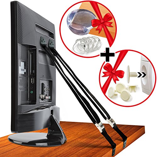 - TOP OF THE LINE HEAVY DUTY SUPPORT STRAPS: The COSMOSAFETY ANTI-TIP SAFETY STRAPS contain only metal and stainless steel parts with durable straps, so there are no plastic parts, Velcro, or glue; they can support a television, heavy appliance, or furniture securely in case of being tipped or an earthquake; the package comes with 2 straps, all required hardware, 4 furniture corner protectors, 4 electric socket plug covers, instructions, and a surprise gift in a designer box ready for giving;