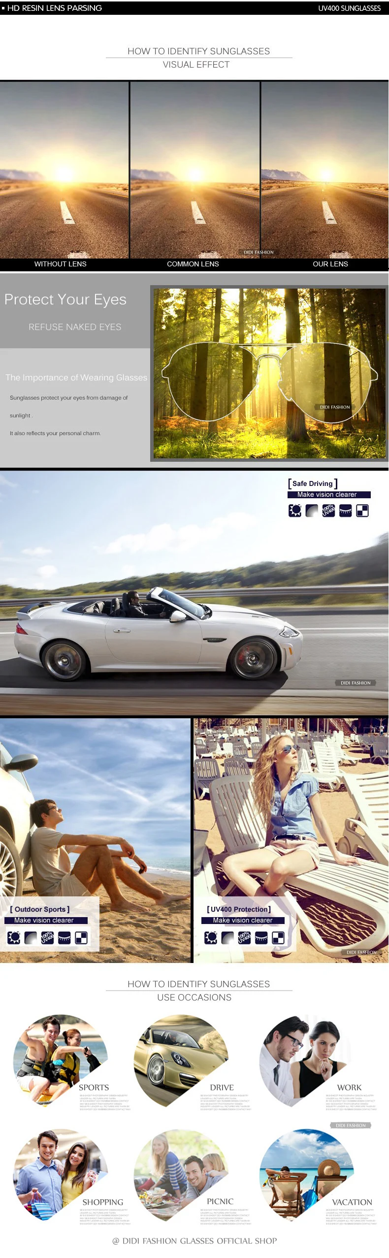 Lense Color:Black Lens, Gray Lens,Clear Lens,UV400,Full UV Protection Lens