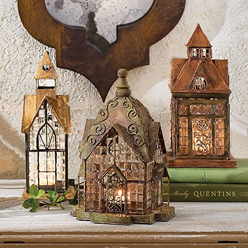 Set Of 3 Glass And Metal Candle Lanterns - Classic European Architectural Houses
