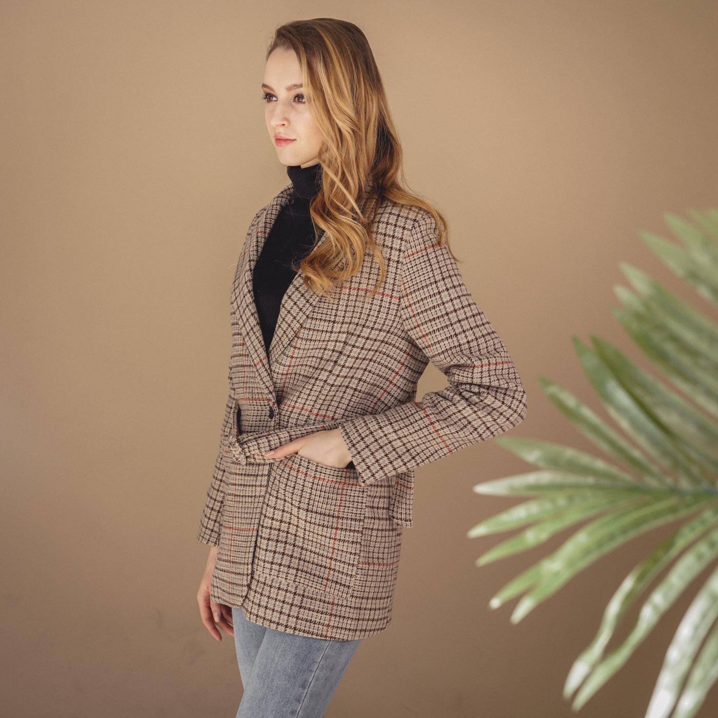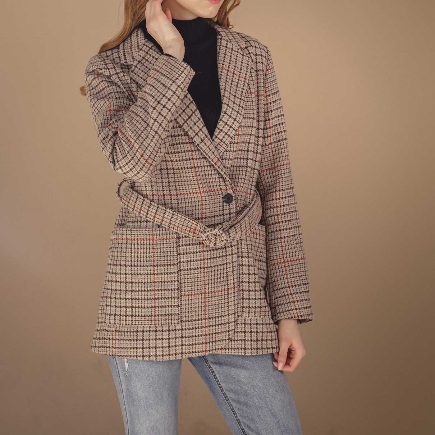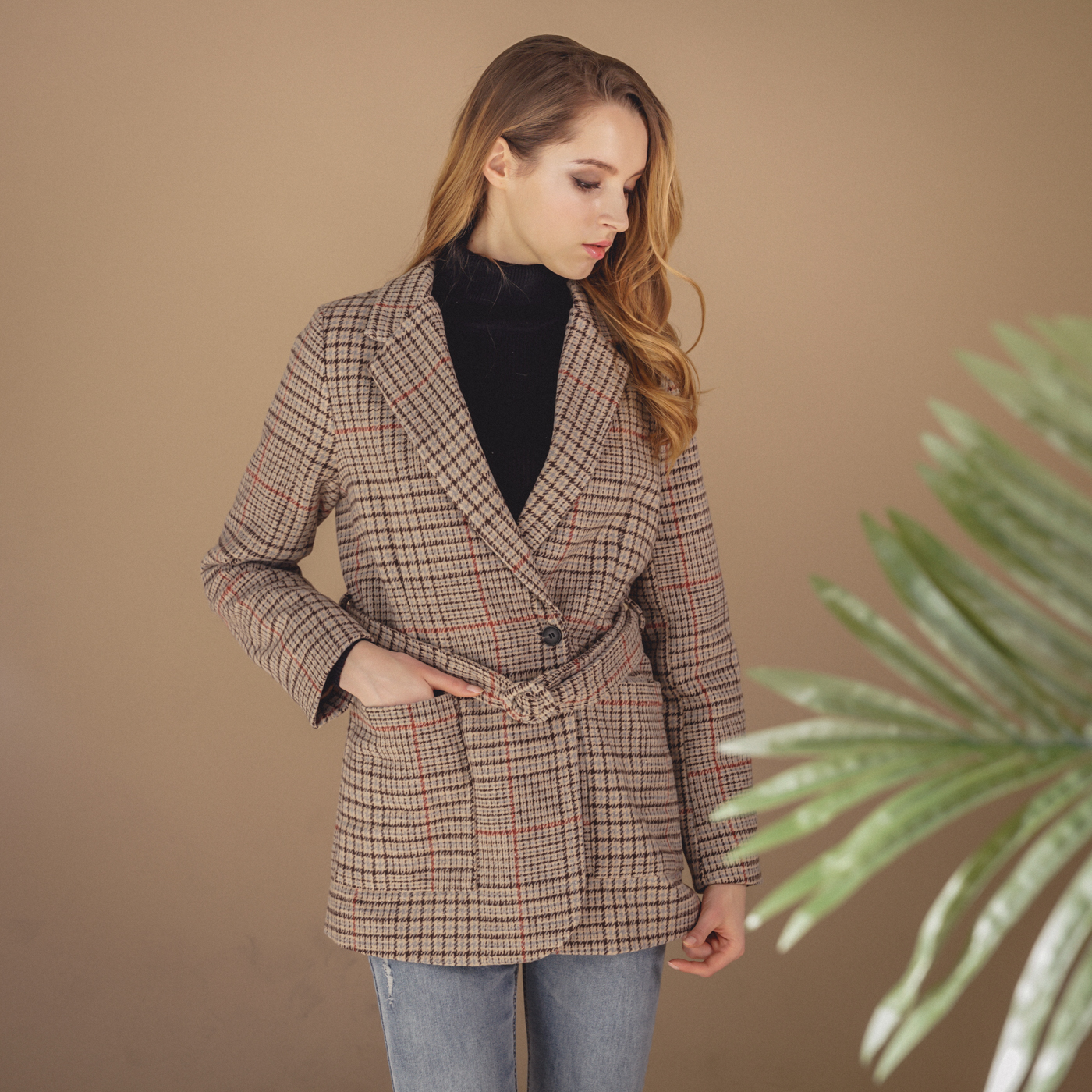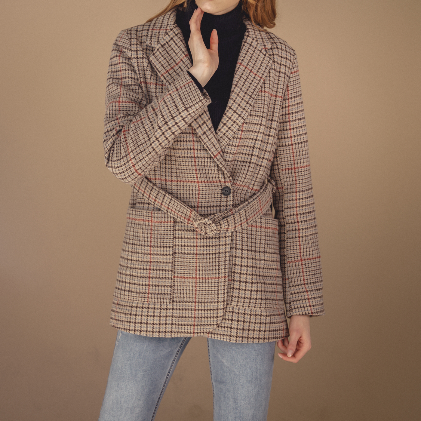 힙선을 덮는 길이와 잔잔한 체크 컬러톤이 코디하기 무난한 스타일의 자켓입니다.