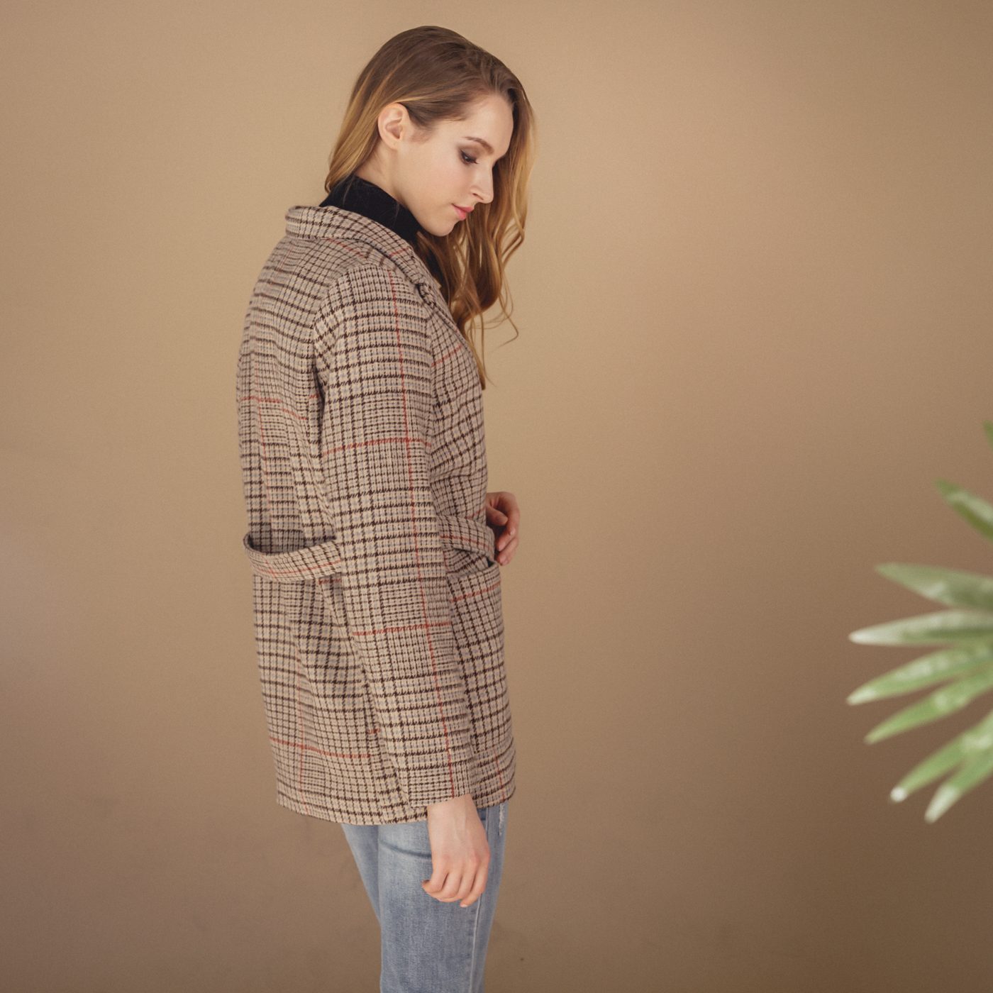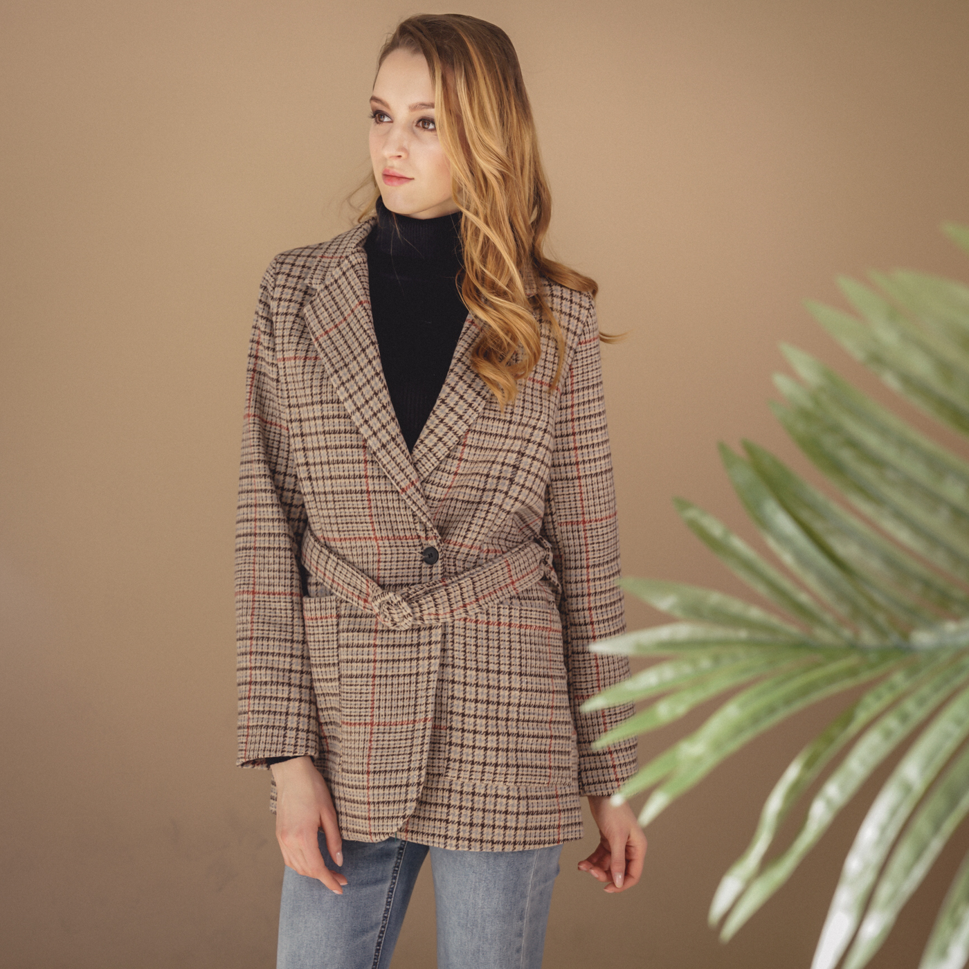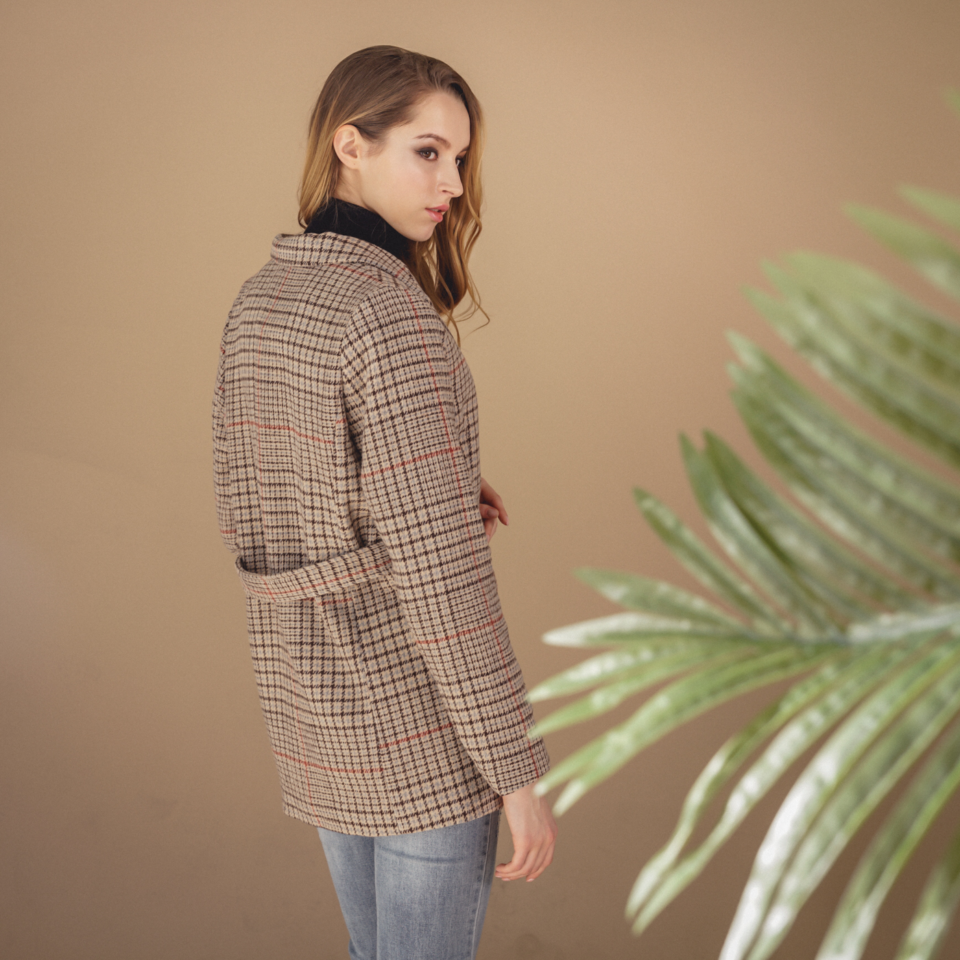 힙선을 덮는 길이와 잔잔한 체크 컬러톤이 코디하기 무난한 스타일의 자켓입니다.