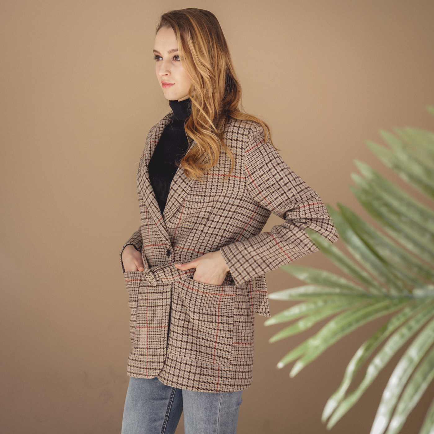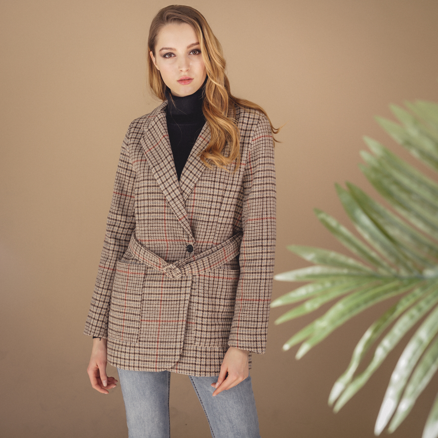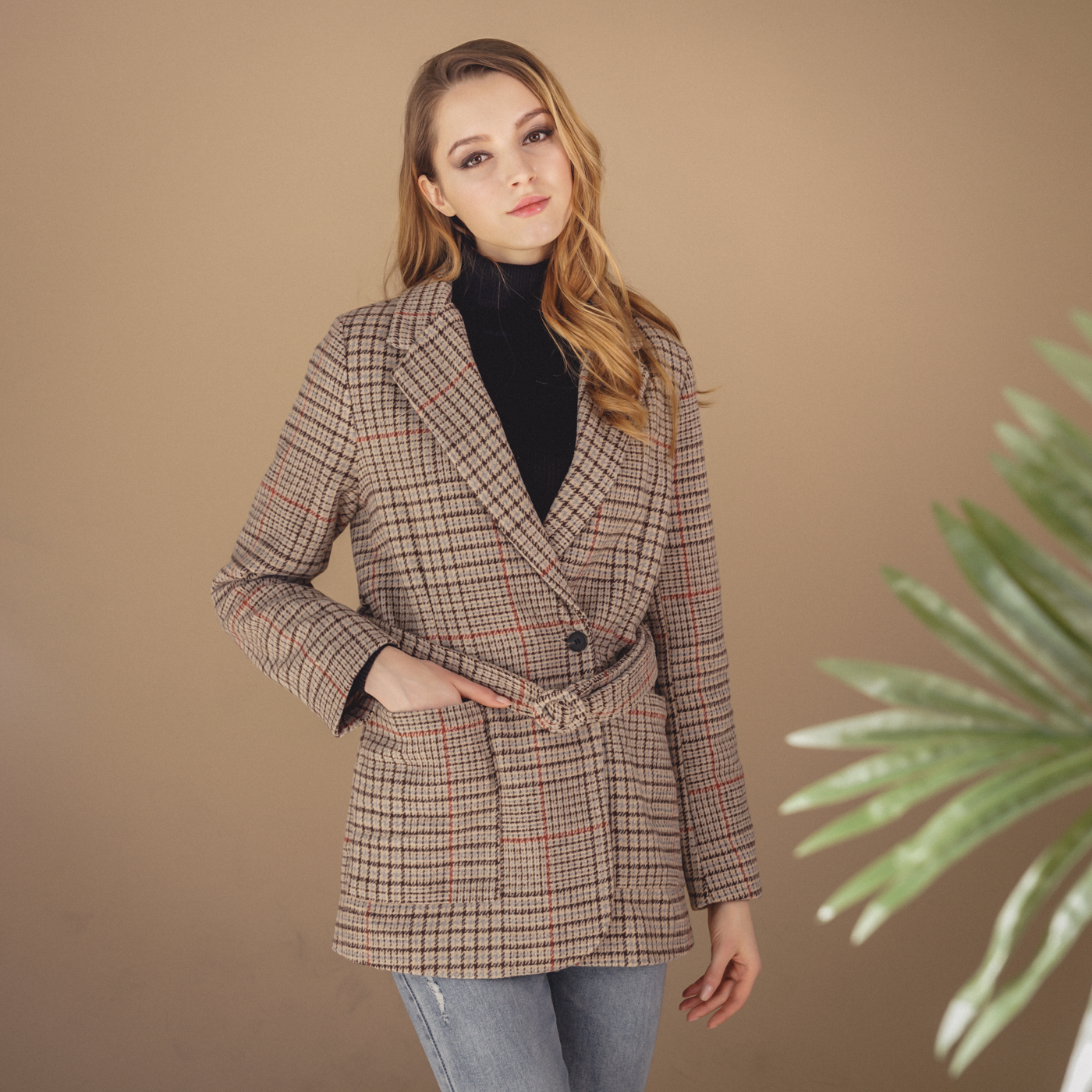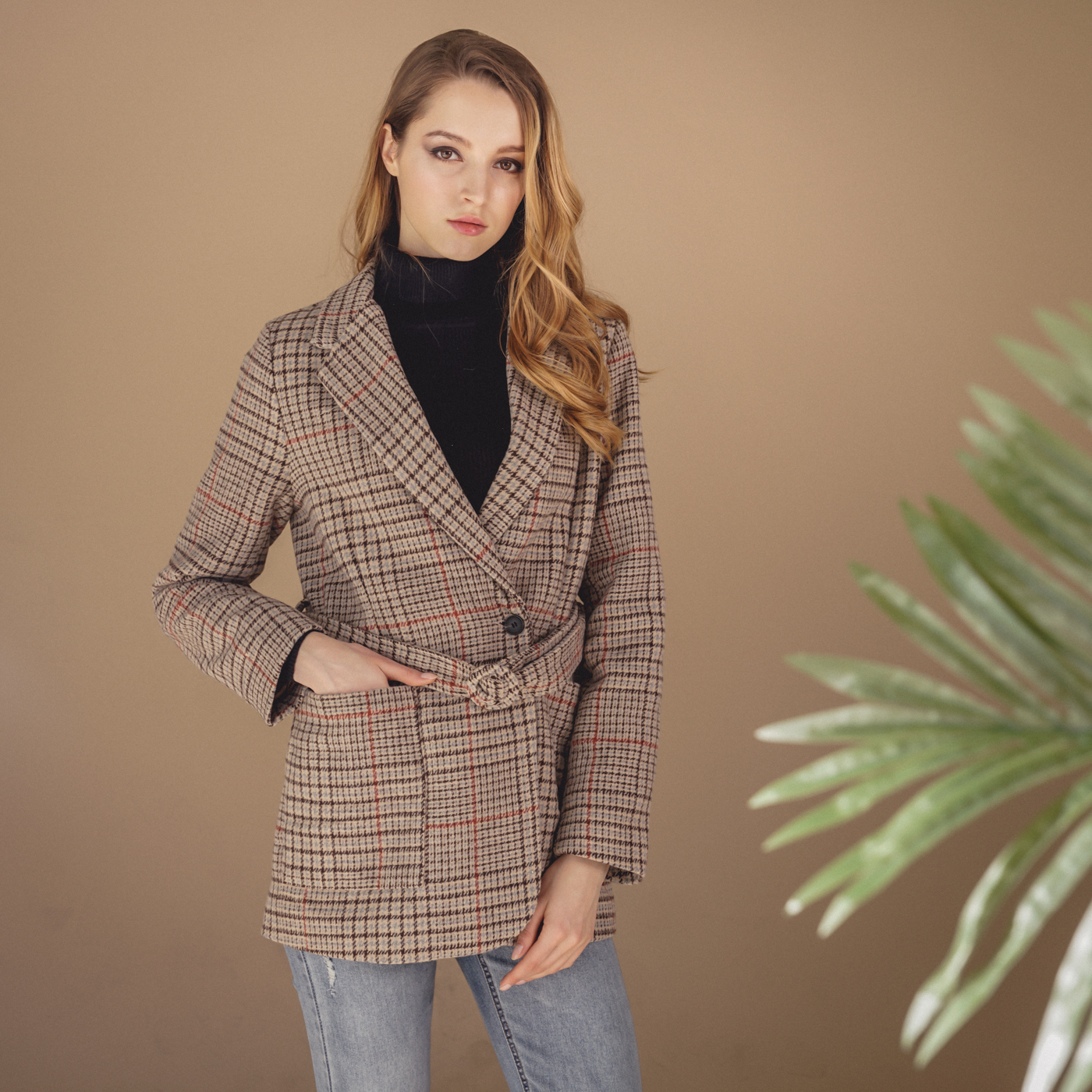 힙선을 덮는 길이와 잔잔한 체크 컬러톤이 코디하기 무난한 스타일의 자켓입니다.