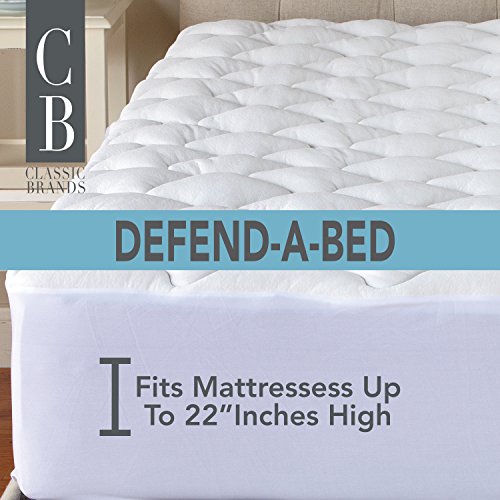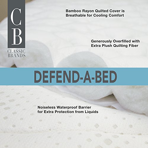Studio : Classic Brands Publisher : Classic Brands Binding : Kitchen Product Description Classic Brands Defend-A-Bed Ultimate Bamboo-Rayon Quilted Waterproof Mattress Protector is the perfect addition to your new sleep system. The 100% waterproof mattress protector guards against spills and stains, bodily fluids, and allergens and is a great solution for those with kids, pets, allergies, or for those that simply just want to protect their investment and extend the life of their new mattress. The super silky plush bamboo rayon cover is overly filled with hypoallergenic alternative down and provides a noiseless barrier, providing silent protection that doesn't disturb your valuable sleep.