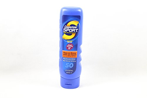 Coppertone Sport High Performance Lotion SPF 50 Water Resistant 8oz broad spectrum SPF 50 UVA/UVB stays on strong when you sweat (wont run into your eyes and sting) plus antioxidant defence water resistant (80 minutes)Feature