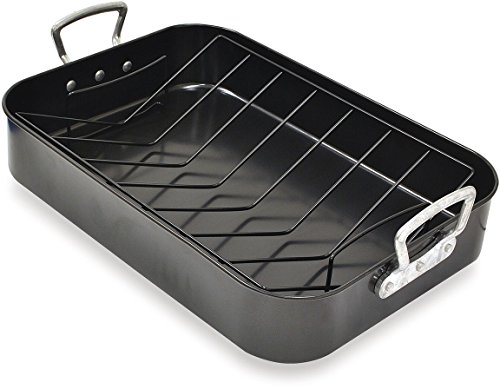 -. Feature : Extra Large 18" x 13" / Non-stick roast pan and V rack / Dishwasher safe / Heavy duty steel / Fixed aluminium handle