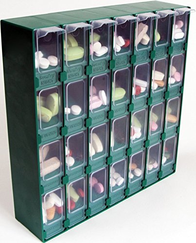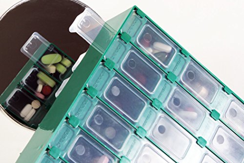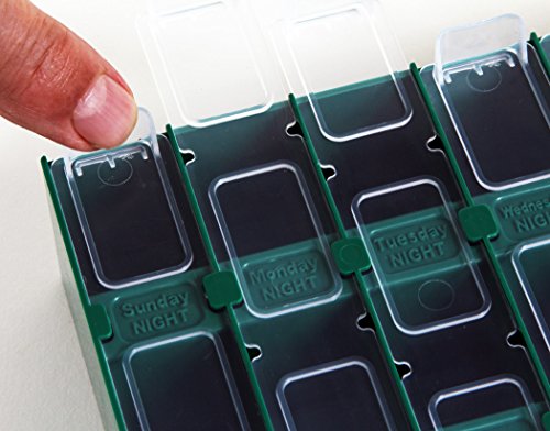 Double the compartments: using a proprietary mirror-image design, the front and reverse of the pill organizer is IDENTICAL; 28 spacious compartments PER SIDE!