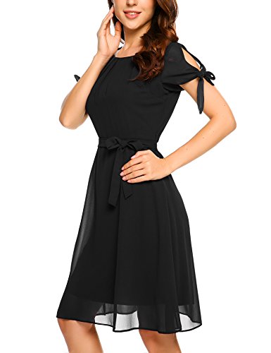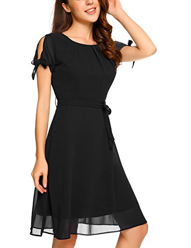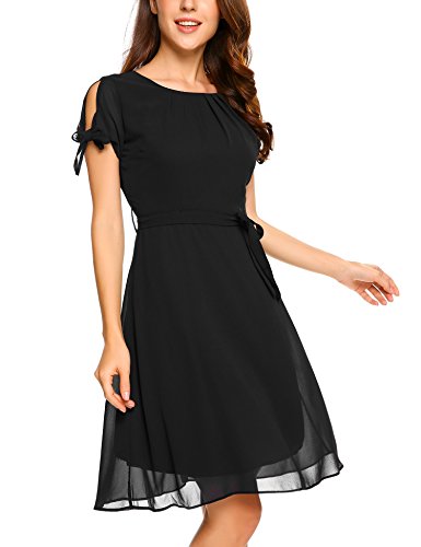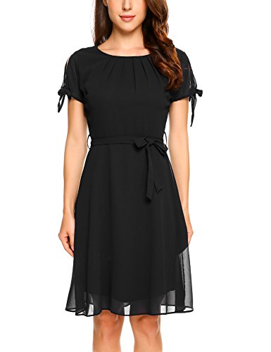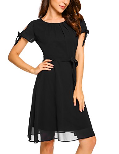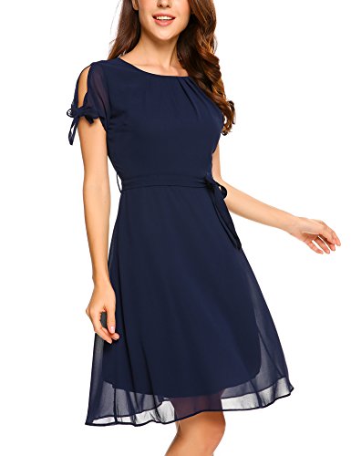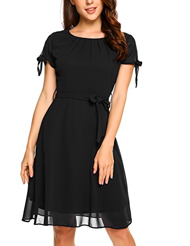 It is a classic chiffon dress featuring O-Neck pleated front design, a wonderful way to show your chestline, Lace up split short Sleeve adds the sense of fashion and vigour. Slim fit and flare hemline, the lining is shorter than the outer layer, Looks sexy and flirty, It also highlights the waist in a comfortable slim fit making it perfect for all occasions.