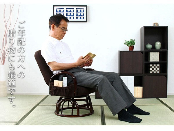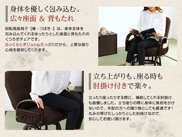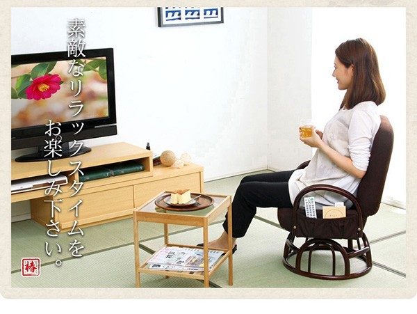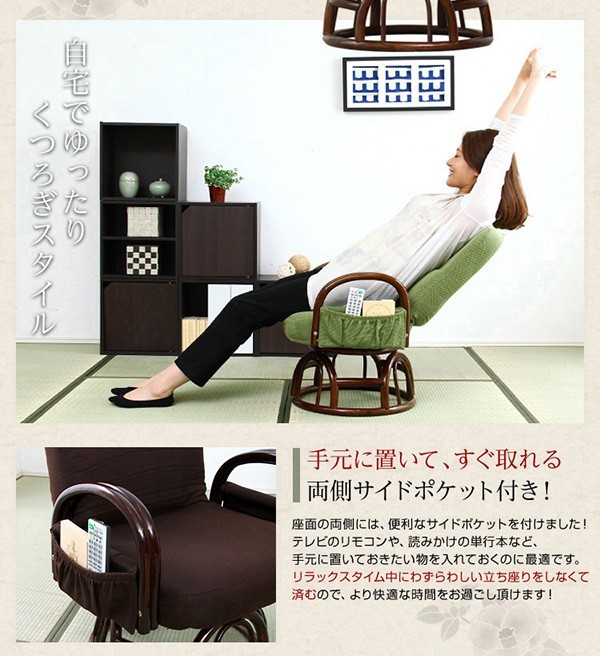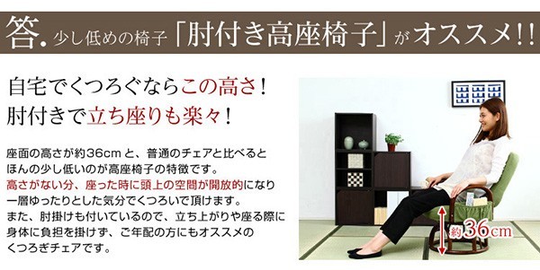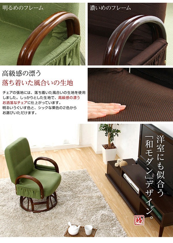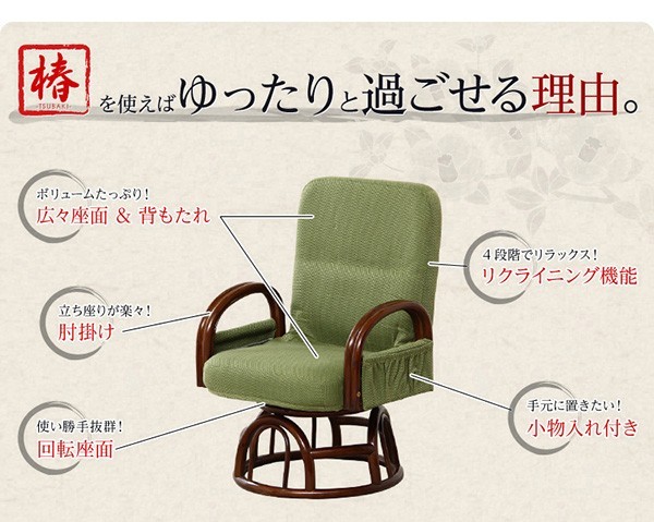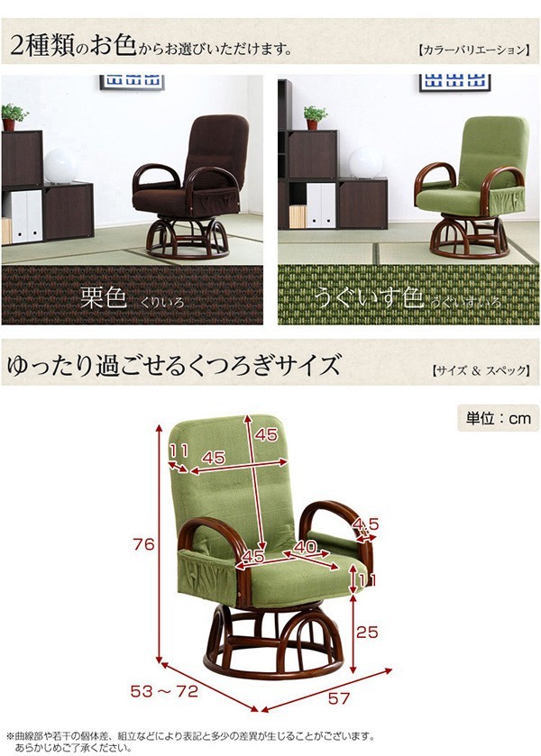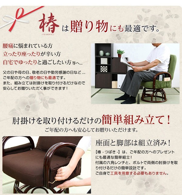 【商品について】腰掛けしやすい肘掛け付き回転高座椅子【椿-つばき-】■サイズ:外寸:(約)幅57x奥行き53~72x高さ76cm 座面高(約)36cm※商品重量:(約)9.5kg■カラー:栗色 うぐいす色■素材:構造部材:金属(スチールパイプ)、脚部/籐張材:ポリエステル 100%クッション材:ウレタンフォーム■その他:・お客様組み立て品です・梱包サイズ:(約)47x46x44cm(3.5才)・梱包重量:(約)10.5kg