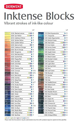 Derwent Inktense blocks are versatile, watersoluble, chunky blocks of vibrant ink-like color that bring a fresh perspective to your work. Use them to apply color directly to wet or dry paper or fabric and turn them on their side to cover larger areas. Dry, they deliver pure, vibrant color. Washed out, they become transparent, ink-like paint that can be worked over when dry. Inktense Blocks can also be used for rubber stamping and decoupage and are ideal for loose, expressive landscapes and colorful still lifes. They also can be used with fabric to create stunning silk paintings and quilts. They work beautifully with Derwent Inktense pencils.