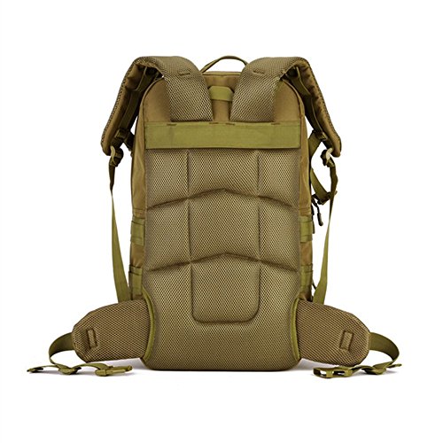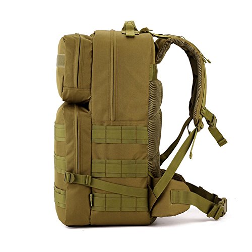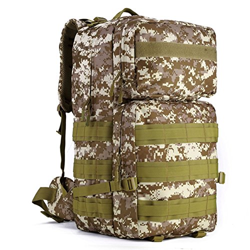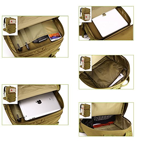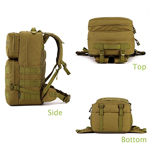 -. Feature : Large Capacity ---capacityoverall about55L with total of 4 compartments, can be used as 3-Day Assault Pack; main compartment dimensions approx: 22.8"x12.9"x6.3"(Height*Width*Depth) which can fits 17" laptop. / Comfortable Design --- ①mesh ventilated padded back panel with Velcro top closurefor extra comfort and maximum airflow; ②adjustable contoured padded shoulder straps with adjustable detachable waist strap and sternum strap for extremelyrelease heavy load and practical. / AdaptableMolle Webbing --- Molle webbing throughout for attaching additional pouches or gear, such as cell phone bag, water bottle bag, saddlebag, and accessory kit bag etc; which can extremely expand space. / Super Durability --- ①made of very strong military specification nylon material and reinforced stitching throughout where would tear over time; ②PVC coatedLining makes it semi-waterproofto ensure the strength in wet environments, or get rid of rot after the invasion of water. / Varied Application --- can be used as BOB, daypack, or travel pack. Great choice for outdoor activities: camping, hiking, trekking, traveling, etc; suitable for man and woman.