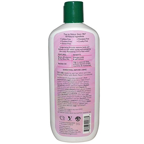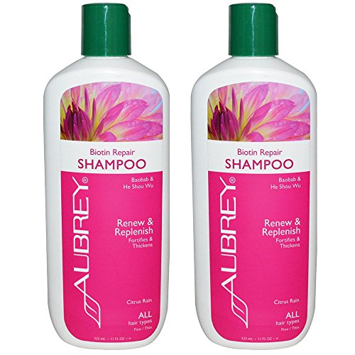 This bundle includes two bottles of 11 fl oz (325 ml) Aubrey Organics Biotin Repair Shampoo for All Hair Types. About the Product * Baobab and He Shou Wu * Fortifies and Thickens * Renew and Replenish * All Hair Types * Fine / Thin * True to Nature Since 1967 * All-Natural Ingredients * Sulfate-Free * Paraben-Free * Gluten-Free * Phthalate-Free * Cruelty-Free * Vegetarian * Gluten Free * Contents Biodegradable * Invigorating formula restores body and fullness to hair while toning and energizing the scalp. Revitalizing Citrus Rain scent! * Biotin (B vitamin) and He Shou Wu- Energize scalp and add fullness. * Baobab Oil- High in essential fatty acids and vitamins D and E; nourishes and moisturizes.Feature