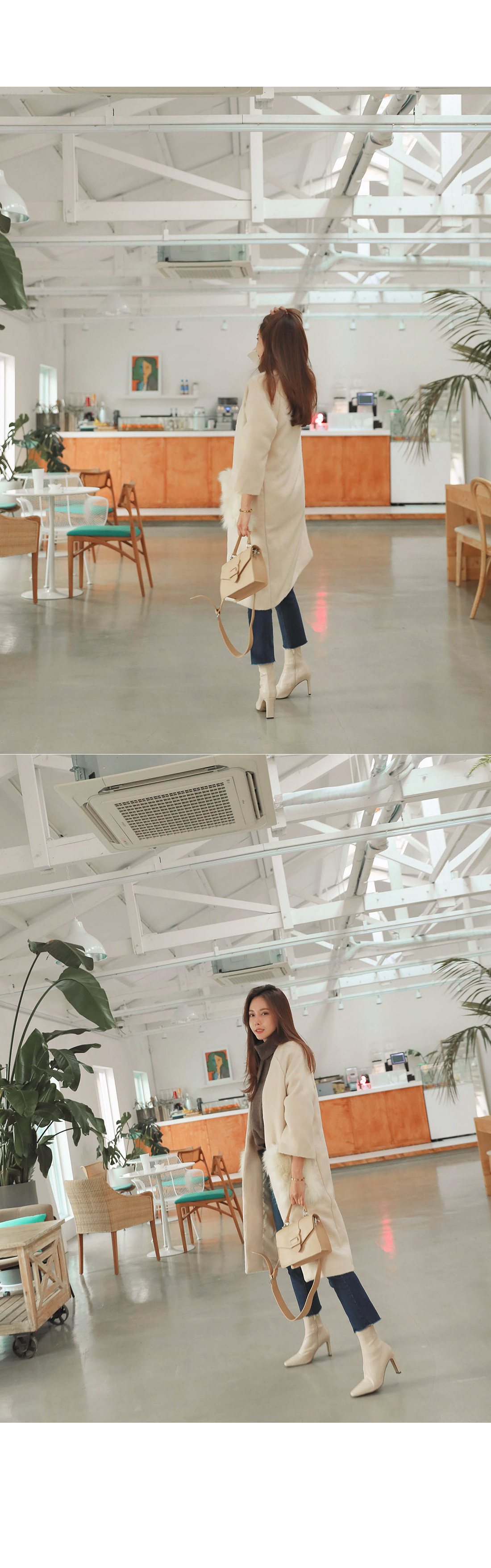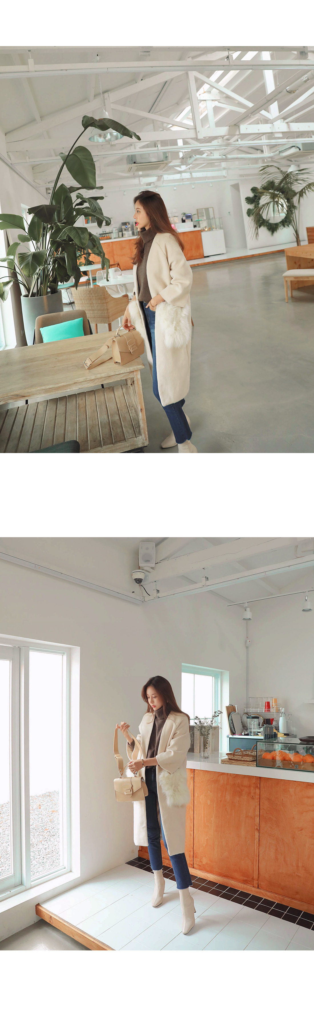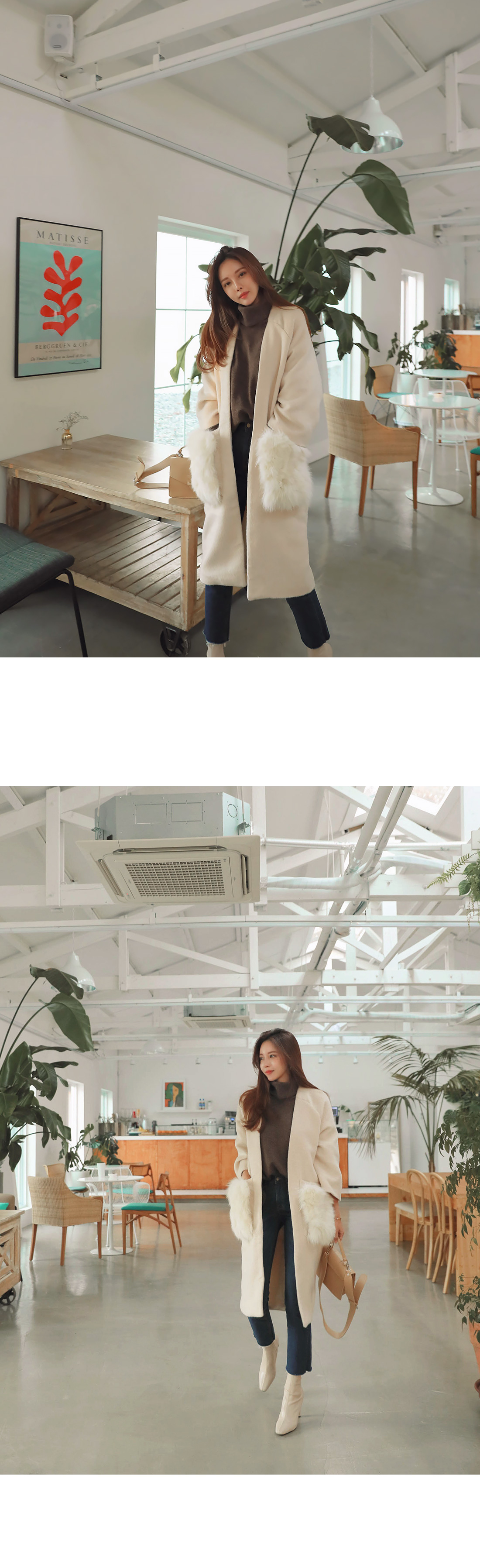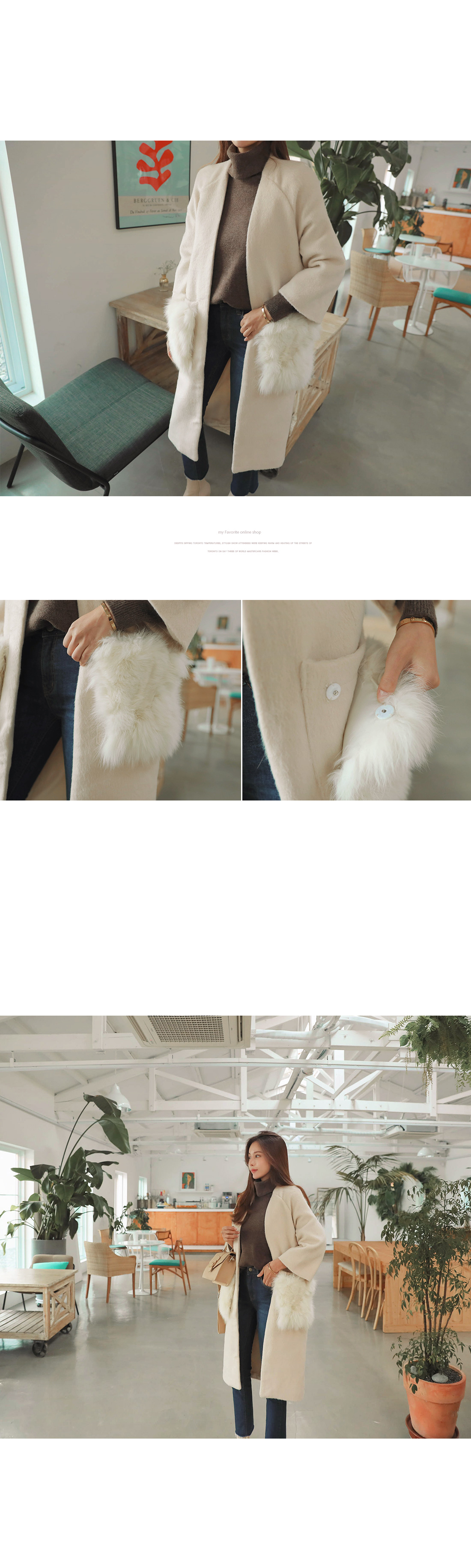 MD COMMENT고급스러운 분위기 느껴지는 폭스퍼 코트를 소개해드릴게요.탈부착 가능한 폭스퍼로 두가지 연출이 가능하며오픈코트로 가디건처럼 편하게 걸치기 좋으실거에요. 알파카에 울이 함량된 소재로 부드러운 촉감을 느끼실 수 있구요. 여유있는 핏감에 힙을 덮는 기장으로 체형커버 효과를 주면서 넓은 폭에 살짝은 짧은 기장의 소매가 여성스러운 느낌을 살려준답니다. 폭스퍼로 은은한 고급스러운 분위기 연출이 가능하며 슬랙스나 미디 스커트와 매칭해주면더욱 우아하면서 고급스러운 분위기를 느끼실수있어요 .모델처럼 데님과 함께 매칭해주면캐주얼한 무드가 가능하답니다.COLOR/SIZE아이보리,브라운FREEMODEL FITTING아이보리/FREE