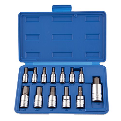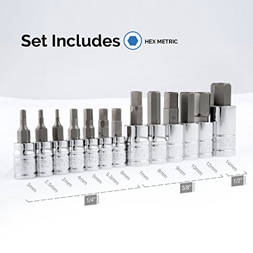 - 13-Piece Metric hex bit socket set includes: 1/4” Drive: 2mm, 2.5mm, 3mm, 4mm, 5mm, 5.5mm, 6mm; 3/8” Drive: 7mm, 8mm, 9mm, 10mm, 12mm; 1/2” Drive: 14mm