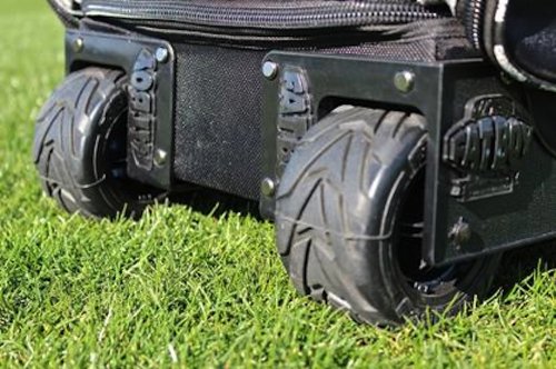 -. Feature : Expandable shin guard pocket for easy storage / Shelving system to keep equipment organized / Fatboy wheel technology to go over any terrain / Embroidery patch for personalization / Heavy duty materials and stitching for longer life