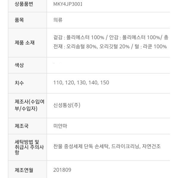 보온성이 탁월한 솜털80% 깃털20% 덕 다운 점퍼 입니다.