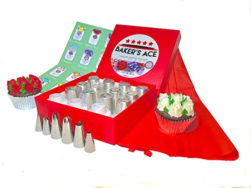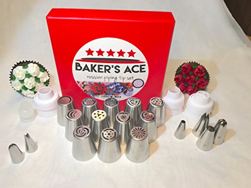 Baker's Ace Russian Piping Tips Set | Cake and Cupcake Decorating Supplies | Great Kitchen Gift | Includes 12 Russian 2 Leaf 2 Round and 2 Star Icing Nozzles 3 Reusable and 10 Disposable Piping Bags