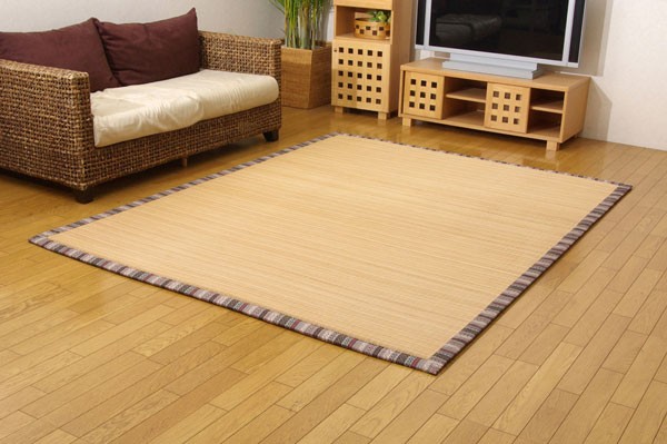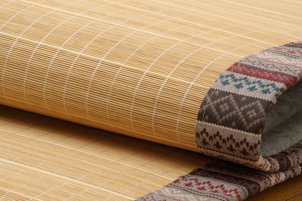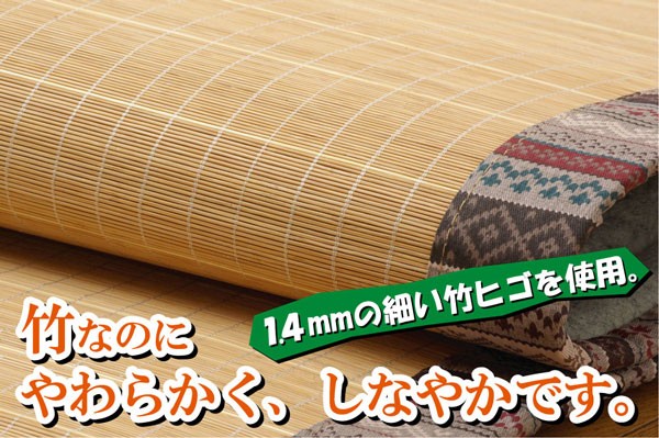 エスニック調の柄をヘリに使用した竹カーペットです。孟宗竹の表面付近の目がぎっしり詰まった部分のみを使用しました。竹の皮下部分は汚れにくく、耐久性に優れ、熱伝導率が高いため、ひんやり感も抜群です。1.4mmの細ヒゴを使用しています。竹を細ヒゴにすることで、硬いイメージの竹がやわらかく、しなやかになります。またクッション性に特にこだわり、中材にはウレタン13mmを使用しています。プニプニとした柔らかい感触とボリューム感を是非お楽しみ下さい。裏には不織布を貼っていますので、フローリングでのご使用にも最適です。竹は他の木材と比べると格段に成長が早く(3~5年で成竹)、持続的生産が可能な環境に優しいサスティナブルな素材です。