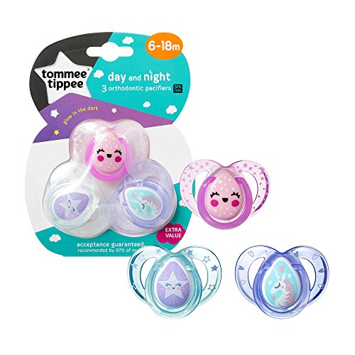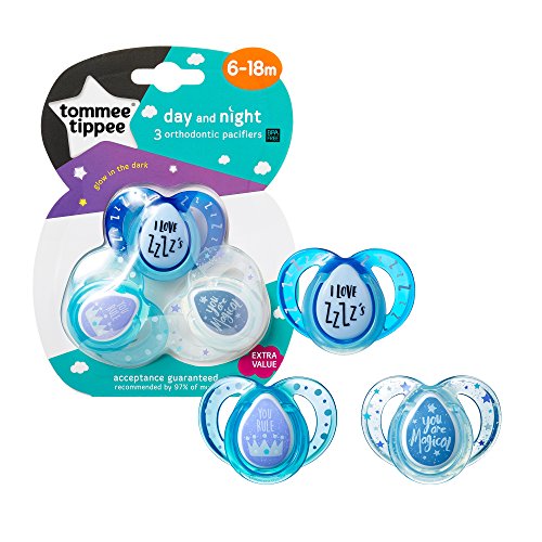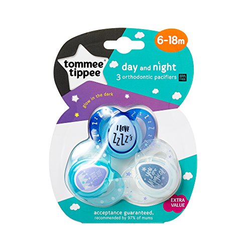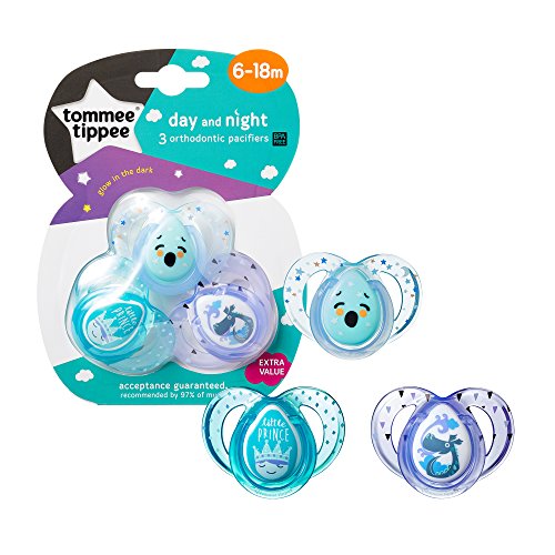 -. Binding : Baby Product -. Brand : Tommee Tippee -. Department : baby-boys -. EAN : 0666519331068 -. Feature : Glow in the dark pacifiers ideal for using at night time / Symmetrical orthodontic shape designed to support natural oral development / Reversible pacifier nipple making it easier for babies to correctly insert the pacifier / The nipple shape on the pacifier is more like a bottle nipple for a more familiar feeling for a baby / All pacifiers BPA-free for ultimate reassurance -. Label : Mayborn Group -. Manufacturer : Mayborn Group -. Model : 533106 -. MPN : 533106 -. NumberOfItems : 1 -. PackageQuantity : 1 -. PartNumber : 533106 -. ProductGroup : Baby Product -. ProductTypeName : BABY_PRODUCT -. Publisher : Mayborn Group -. ReleaseDate : 2017-11-30 -. Size : 6-18 Months -. Studio : Mayborn Group -. Title : Tommee Tippee Day & Night Pacifier, 6-18 Months, 3 Count (Colors will vary) -. UPC : 666519331068