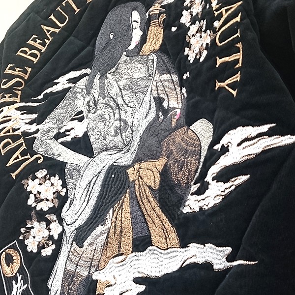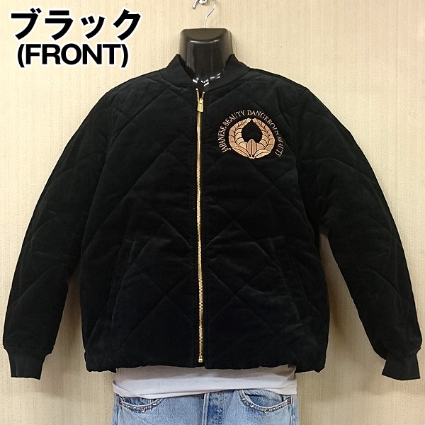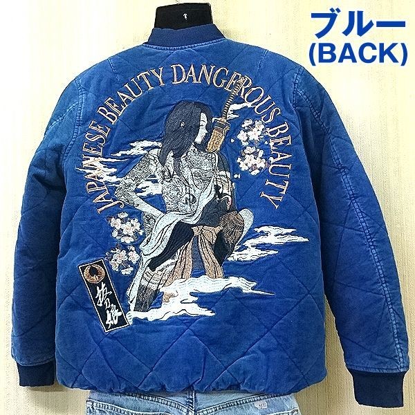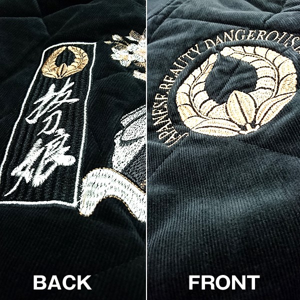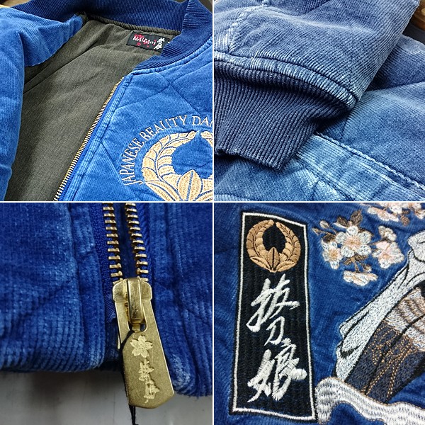 大人気和柄ブランド「抜刀娘」より2017-2018年冬・待望のアウター登場です!今年流行の「コーデュロイ素材」によるカジュアルなMA-1タイプ抜刀娘コレクターを唸らせる、厳選アウターです。数量限定販売!!早い者勝ちです!中綿入りの暖かで羽織りやすい、MA-1タイプのジャンバーです。人気キャラ「結愛」の美しい刺青姿際立つALL刺繍による豪華なあつらえ。フロントには家紋刺繍で粋に仕上がっています。■カラー:ブラック、デニムブルー