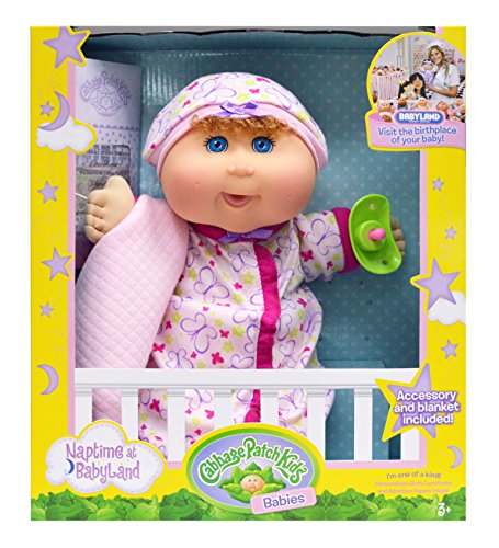 -. Binding : Toy -. Brand : Cabbage Patch Kids -. Color : Blonde/Blue Eye -. Department : unisex-child -. EAN : 0819798019282 -. Feature : Adopt your very own Cabbage Patch Kid 12.5'' baby. / Every Naptime baby is born at Babyland General Hospital and each comes ready for love / Each baby comes with a cozy blanket, a pacifier or bottle and contemporary and cute baby fashions / Get ready to snuggle and take the Oath of Adoption. Find your special 12.5'' Cabbage Patch Kid Baby to adopt today! . / Adopt all three! -. IsAdultProduct : 0 -. Label : Wicked Cool Toys (Domestic) -. Manufacturer : Wicked Cool Toys (Domestic) -. Model : 99201US01 -. MPN : 99201US01 -. PackageQuantity : 1 -. PartNumber : 99201US01 -. ProductGroup : Toy -. ProductTypeName : TOYS_AND_GAMES -. Publisher : Wicked Cool Toys (Domestic) -. Studio : Wicked Cool Toys (Domestic) -. Title : Cabbage Patch Kids 12.5" Naptime Babies - Blonde Hair/Blue Eye Girl (Lavendar Sleep Sack) -. UPC : 819798019282 -. Warranty : No Warranty