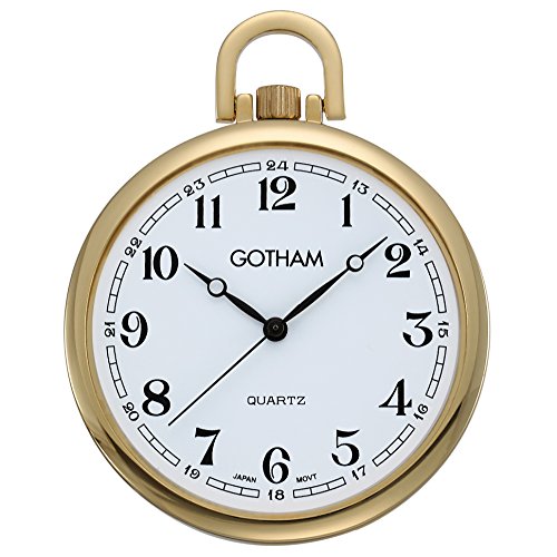 -. Binding : Watch -. Brand : Gotham -. Department : Mens -. Feature : Classic open face gold-tone pocket watch with slim polished brass case suitable for engraving / Rich white dial with classic black Arabic numbers and antique style black hands / Precision Japanese analog quartz movement / Includes matching 14" curb pocket watch chain with belt clip attachment / Arrives with deluxe draw string pouch and gift box, operating instructions and lifetime warranty card -. Label : Gotham -. Manufacturer : Gotham -. MPN : GWC15028GA -. PackageQuantity : 1 -. PartNumber : GWC15028GA -. ProductGroup : Watch -. ProductTypeName : WATCH -. Publisher : Gotham -. Studio : Gotham -. Title : Gotham Men's Gold-Tone Slim Railroad Open Face Quartz Pocket Watch # GWC15028GA