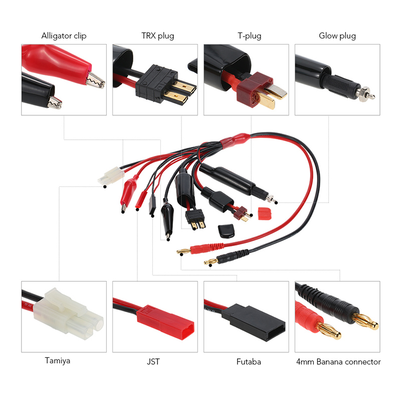 T-plug, JST, Tamiya, Futaba, alligator clip, TRX plug and glow plug