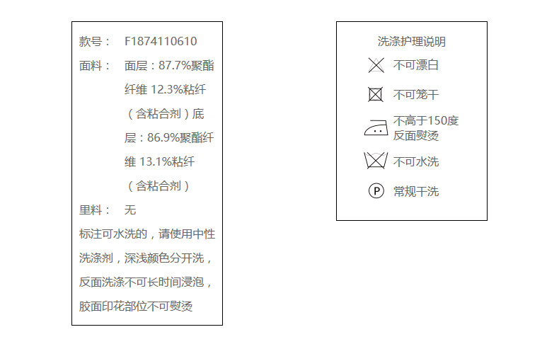 面层:87.7%聚酯纤维 12.3%粘纤(含粘合剂)底层:86.9%聚酯纤维 13.1%粘纤(含粘合剂)