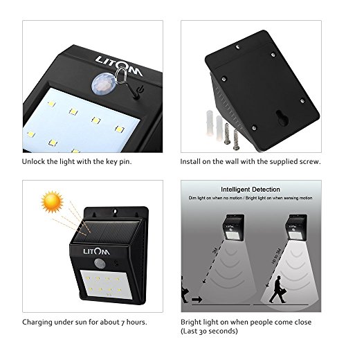 12HRS ILLUMINATE TIME SOLAR MOTION LIGHTS: Comes with the high quality solar panel, makes the LED lamp can fully absorb sunshine in the daytime for lighting at night and illuminate 12 hours after fully charge.