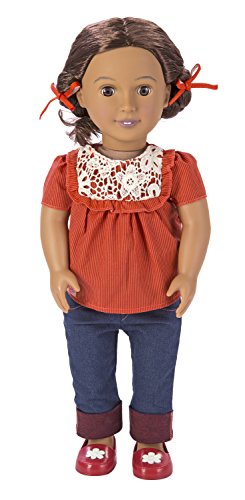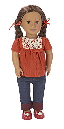 - COMES WITH GREAT STUFF! – This non-poseable Alejandra doll includes 2 cute hair ribbons, 1 frilly top with crochet lace, 1 pair of cuffed blue jeans, 1 pair of undies, and 1 pair of red shoes with flower motif.