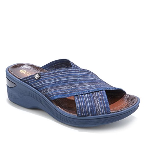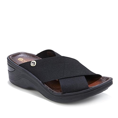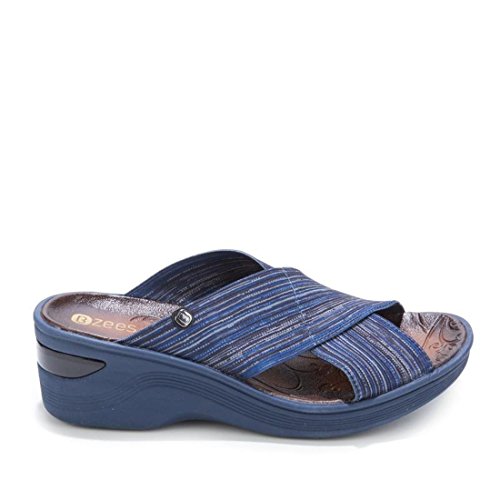 Binding : Apparel Product Description Bzees Desire X-Band Wedge Slide Sandal The x-band style is arguably one of the most comfortable designs you can find. Wide, stretchy straps hug your feet and provide coverage while letting your toes breathe. Slip these on with anything and see how perfectly they complement your wardrobe and your lifestyle. Good to Know 0