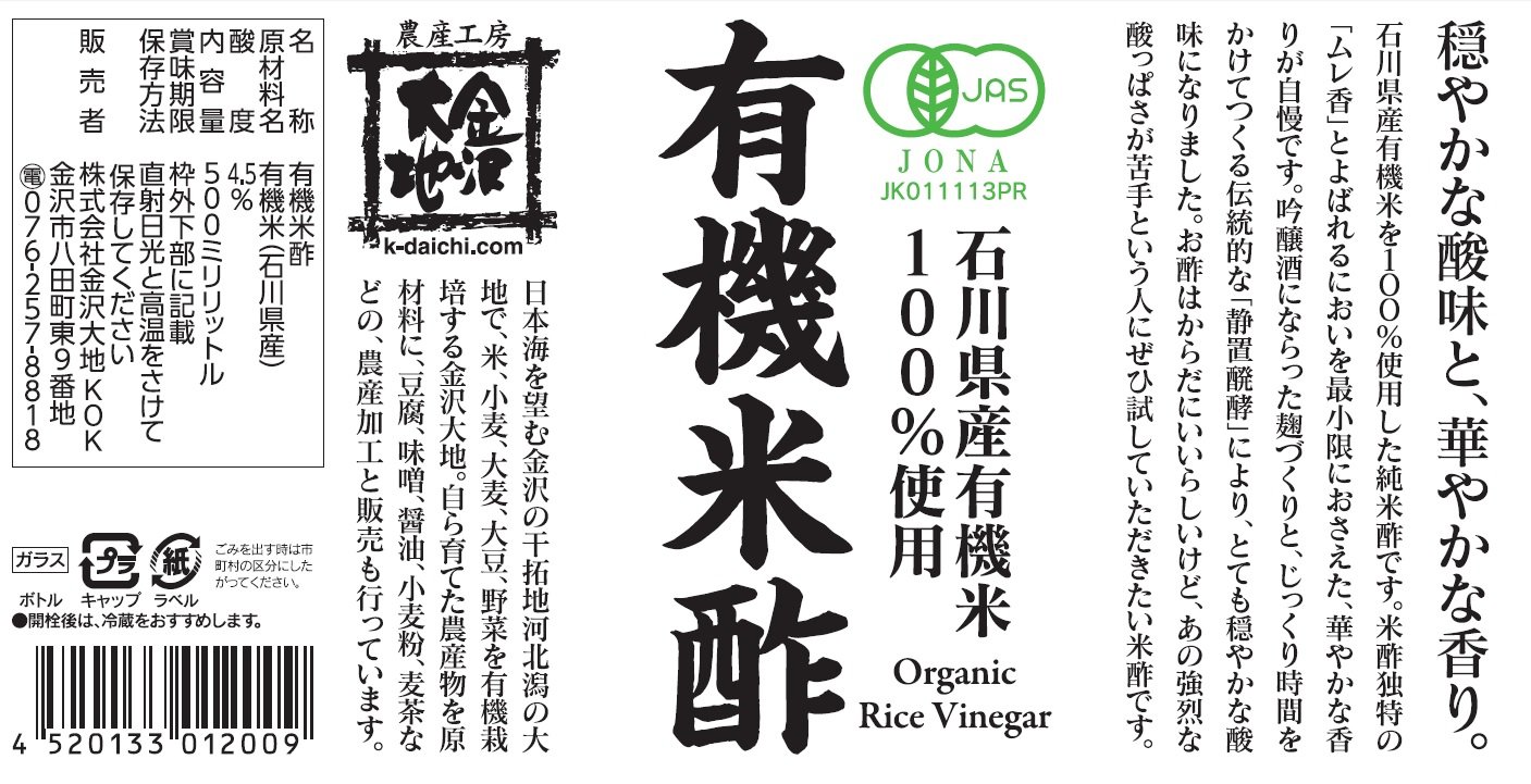 Organic rice vinegar made by Organic Rice from Kanazawa Earth as raw material, made by traditional recipe "Kawahara Vinezo" (Kobara Ezo) (Organic JAS Accredited Factory) which specializes only rice vinegar.