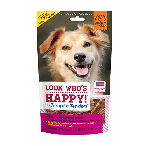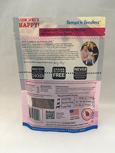 -. Binding : Misc. -. Brand : Look Who's Happy Dog Treats -. EAN : 0855475005148 -. Feature : Made with USA-raised Cage free chicken / Tempt 'n Tenders natural treats are crusted with yummy goodies / Loaded with taste texture and aroma that's truly unique they're a joy for dogs to eat -. Label : Big Creek Foods makers of Look Who's Happy Dog Treats -. Manufacturer : Big Creek Foods makers of Look Who's Happy Dog Treats -. Model : F20005 -. MPN : F20005 -. NumberOfItems : 1 -. PackageQuantity : 1 -. PartNumber : F20005 -. ProductGroup : Pet Products -. ProductTypeName : PET_SUPPLIES -. Publisher : Big Creek Foods makers of Look Who's Happy Dog Treats -. Size : One Size -. Studio : Big Creek Foods makers of Look Who's Happy Dog Treats -. Title : Look Who's Happy Dog Treats 5 oz 1 Pouch Chicken and Cranberry Treat, One Size -. UPC : 855475005148