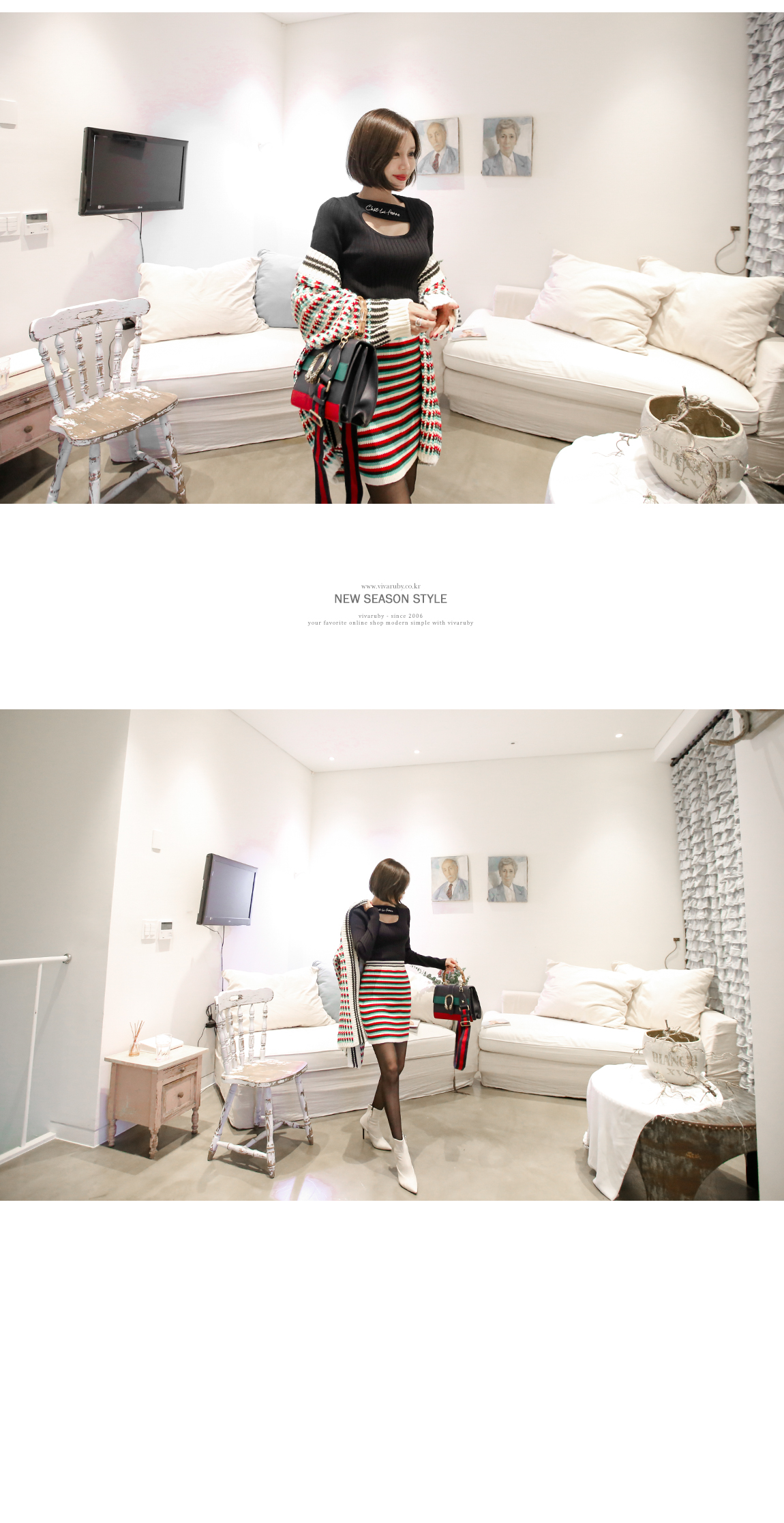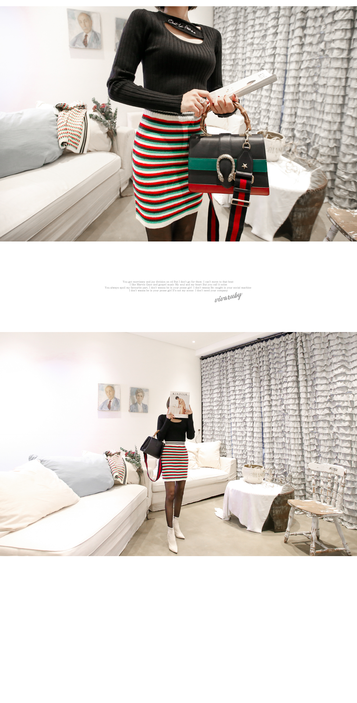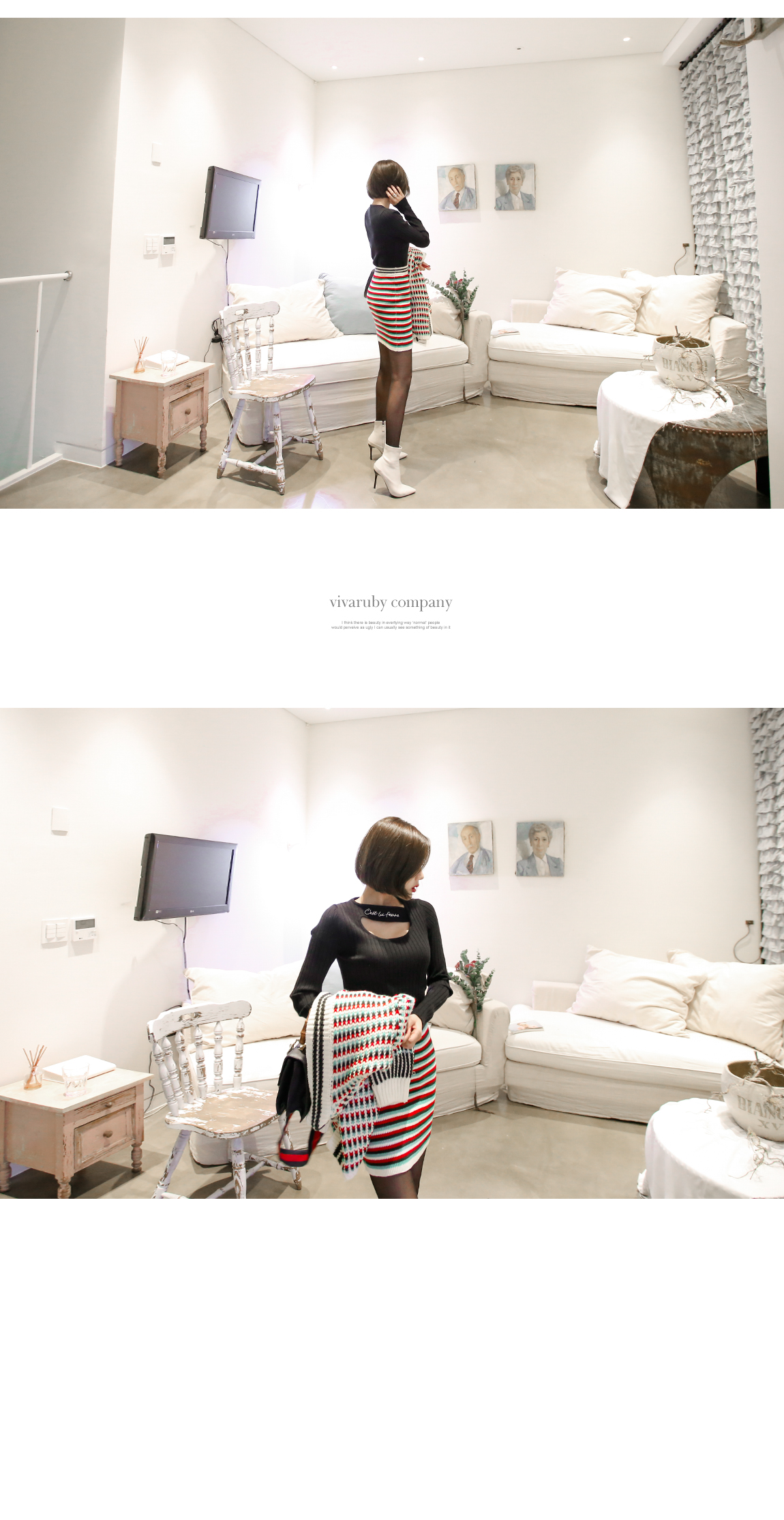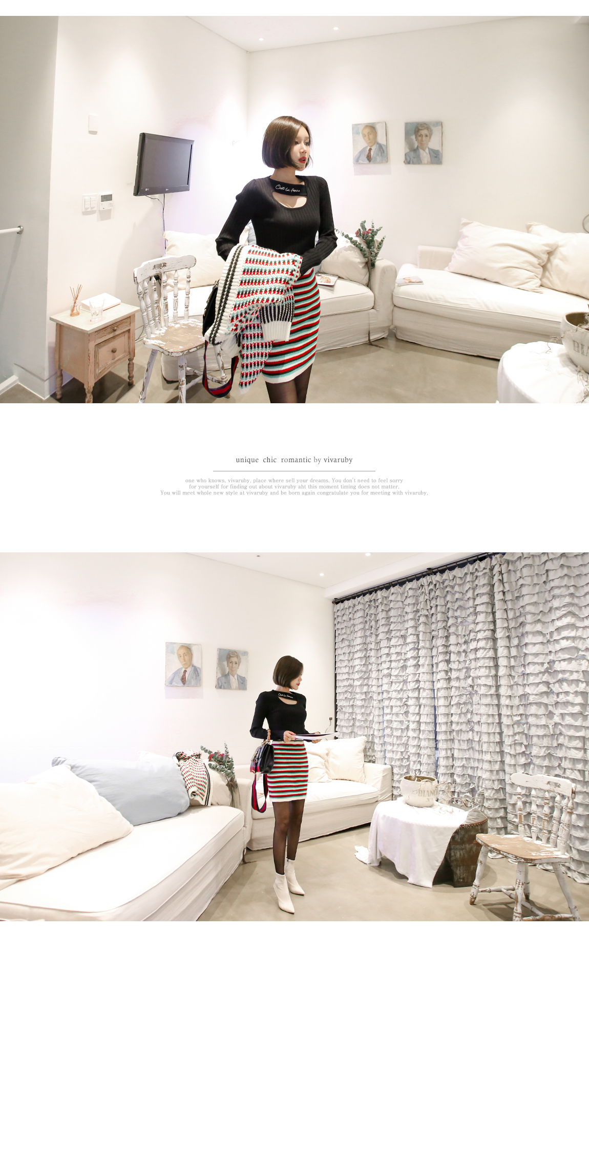 네크라인의 컷팅과 레터링 디테일로 유니크한 포인트를 주었어요