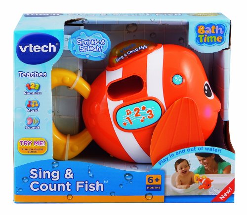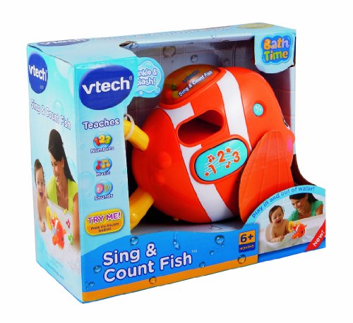 -. Binding : Toy -. Brand : VTech -. EAN : 0885785624876 -. Feature : Motion sensor in the fish recognizes when the fish is tipped to pour out water / Non-leak battery safety / Light-up tail fin for visual effect / Equipped with one sign-a-long song, 5 child-friendly melodies and six playful sounds / Automatic shut-off preserves battery life -. Label : VTech -. Manufacturer : VTech -. Model : 80-113300 -. MPN : 80-113300 -. PackageQuantity : 1 -. PartNumber : 80-113300 -. ProductGroup : Toy -. ProductTypeName : TOYS_AND_GAMES -. Publisher : VTech -. ReleaseDate : 2010-05-23 -. SKU : 10CA1775 -. Studio : VTech -. Title : VTech Sing and Count Fish -. UPC : 885785624876 -. Warranty : N
