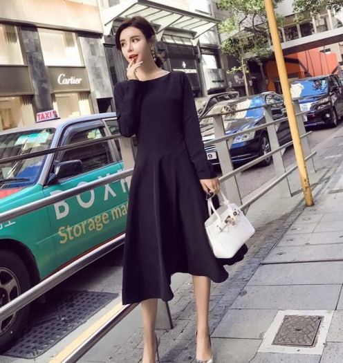 ミモレ丈のブラックフレアワンピース。