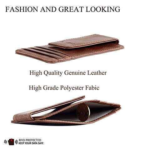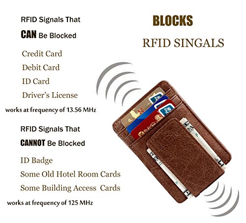 Binding : Apparel Product Description WHAT IS RFID AND HOW THE RFID BLOCKING WALLET WORKS? Radio-frequency identification (RFID) uses electromagnetic fields to automatically identify and track tags attached to objects, which contain electronically stored information. Passive tags collect energy from a nearby RFID reader's interrogating radio waves, which include credit card information, passport identification or other forms of ID as well as access cards etc. Our RFID wallets are lined with enhanced RFID blocking layer to stop pickpockets from scanning and obtaining your credit card or other RFID coded information carried in our wallets. Allow you to enjoy the security and convenience from this RFID wallet all the time anywhere in the world. BENEFITS AND FEATURES: - Fit any jeans pocket. No sharp or annoying edges. - Made of the genuine leather that will you more stand out. - Good space for your cards, cash, bills, driver license etc. - Magnetic Money Clip can hold 15 bills safely and soundly. - Convenient, Portable, Elegant and Fashionable Design. - Perfect gift for friends and family who close to you. - Product Dimensions: 4.53 inches x 2.95 inches x 0.20 inches. WARRANTY CUSTOMER SERVICE: - 90-Day Money Back Guarantee. - 12-Month Replacement Warranty. - Excellent customer service is always ready, ensuring you an enjoyable shopping experience at our store. PLEASE NOTE: - The RFID lining does not shield against some cards that operate at low frequencies of 125 kHz like hotel key cards, employee ID Badges, transit passes etc.- Color may not appear as exactly as in real life due to variations between the computer monitors and nacked eye color difference. Think carefully before your purchase. Thank you for your understanding. PACKAGE INCLUDE: 1 X RFID Blocking Wallet 0