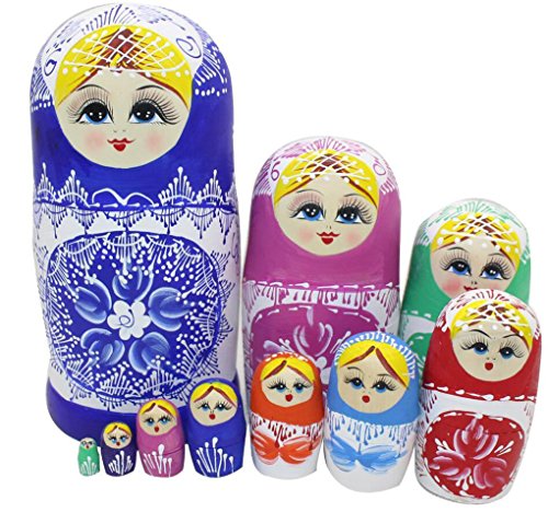 -. Feature : Traditional russian nesting dolls/russian dolls/matryoshka dolls / Contains 10 dolls,stack into one another to appear as one / Blonde little girl with pink eye shadow and flowers pattern in kinds of bright colors / Children's great toy and wonderful decoration for house / Ideal gift in birthday,christmas or any special day